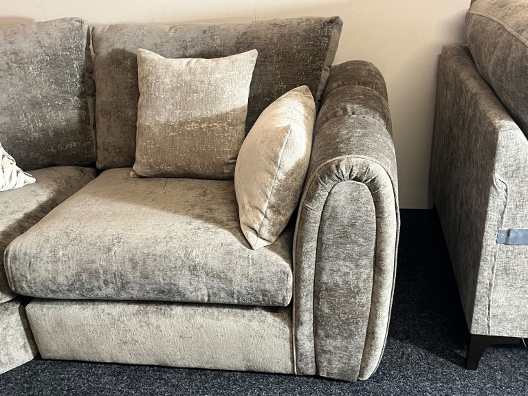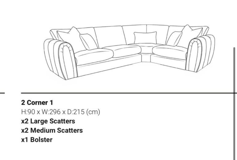 This is a stunning corner with thick comfy cushions to sit down and relax on. Comes with plastic feet all round with two scatter cushions and one Snuggie cushion.