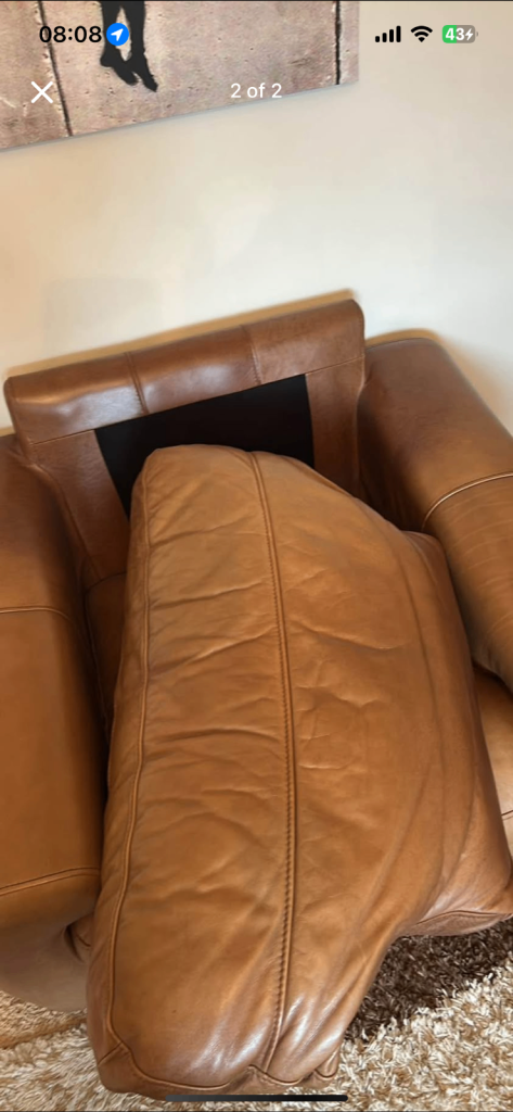 Armchair no longer needed in brown leather with removable back cushions. Seat cushion does not come off. Buyer to collect