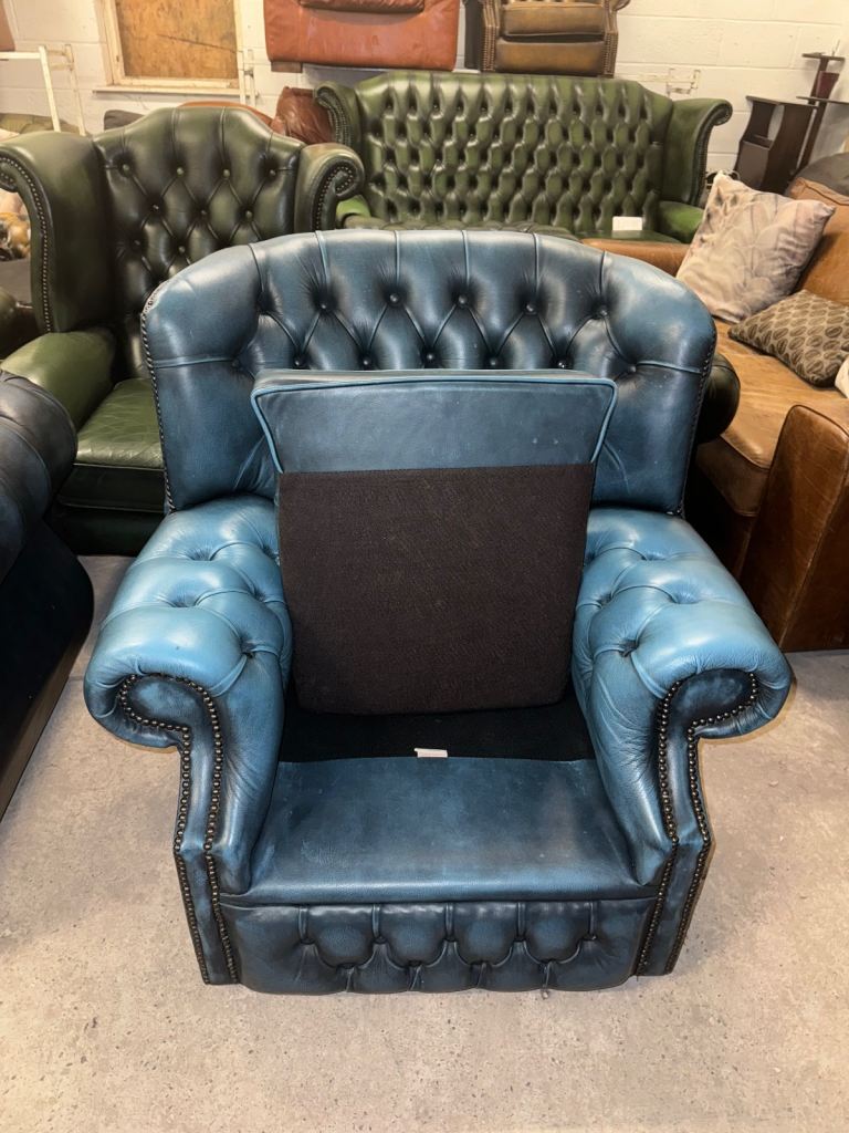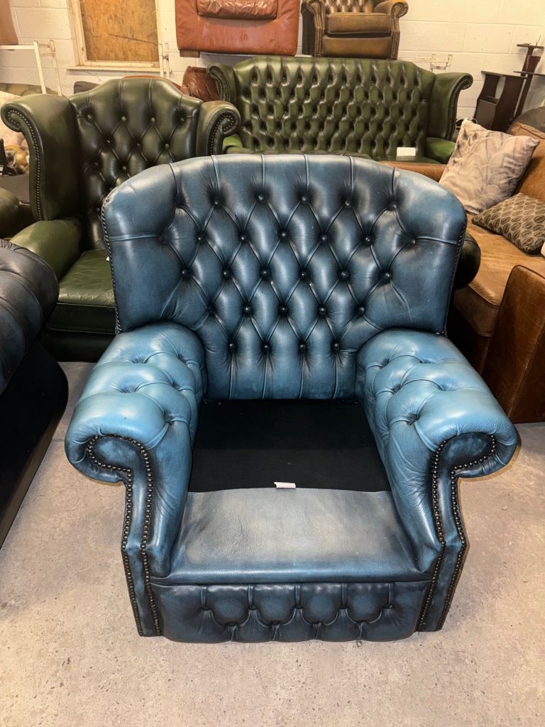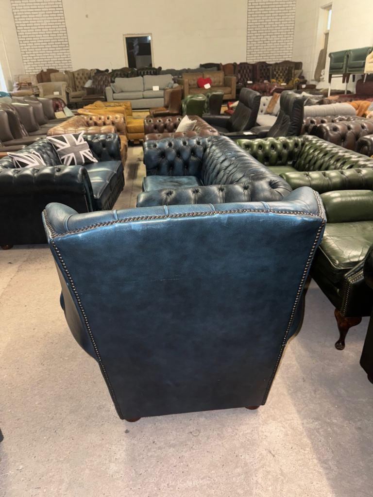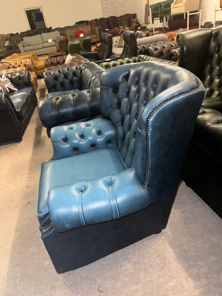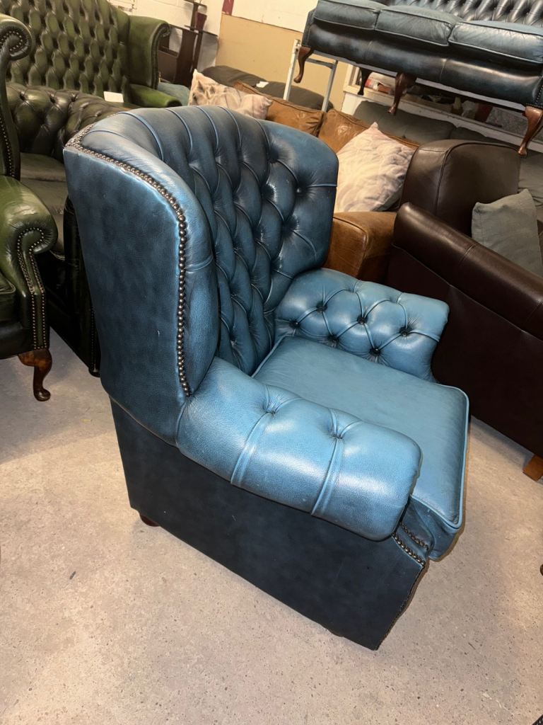 Chesterfield rare blue real leather wingback chair with studding