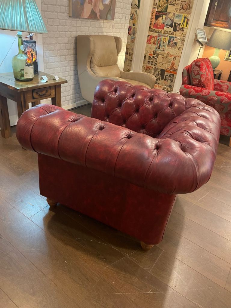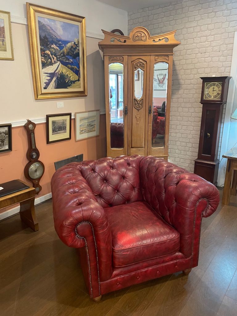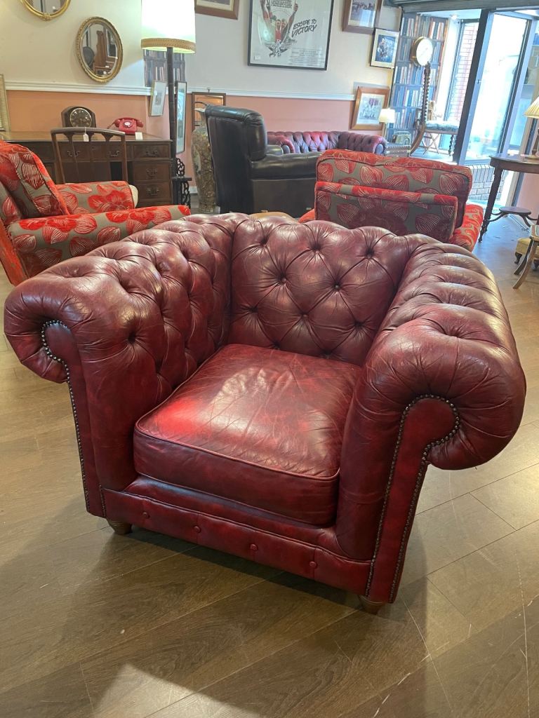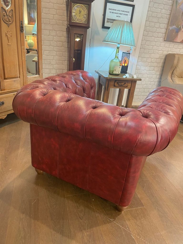 Handsome chesterfield armchair, in lovely condition. Size 120 cm wide x 105 cm deep by 77 cm high. Can be viewed and sat on at Penny Lane Vintage Wellfield Court Arcade Wellfield Road Roath Cardiff CF24 3PB