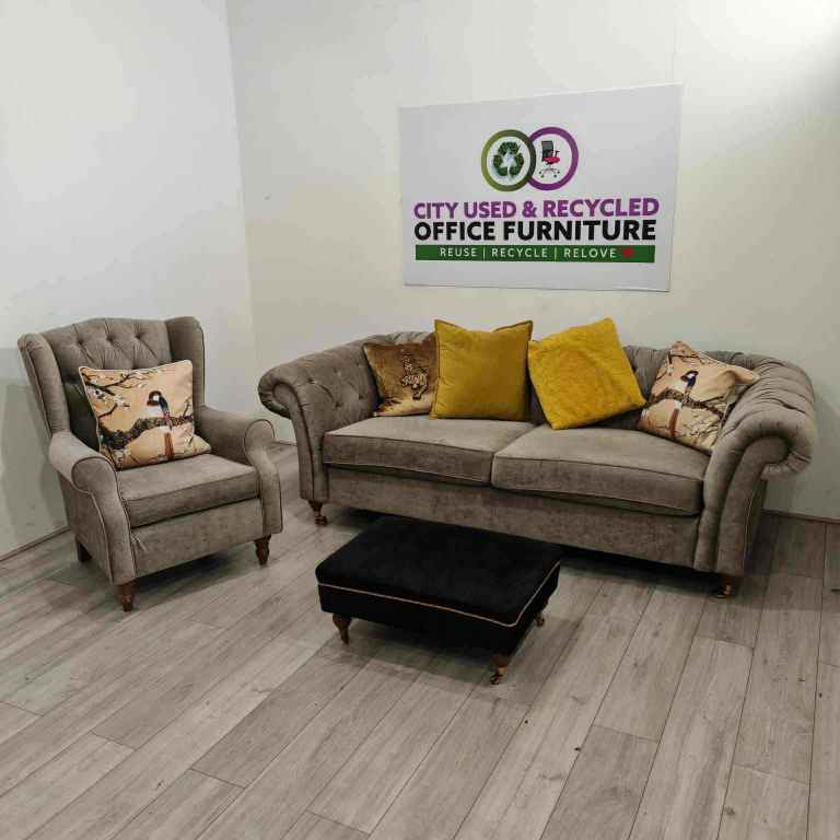 Chesterfield Lounge Suite – 2-Seater Sofa, Armchair, Pouffe, Grey / Black Velvet