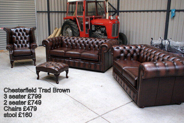 Full hide leather chesterfield wing chairs £539,2 seaters £849,3 seaters £899,club chairs £539,office chairs £649.