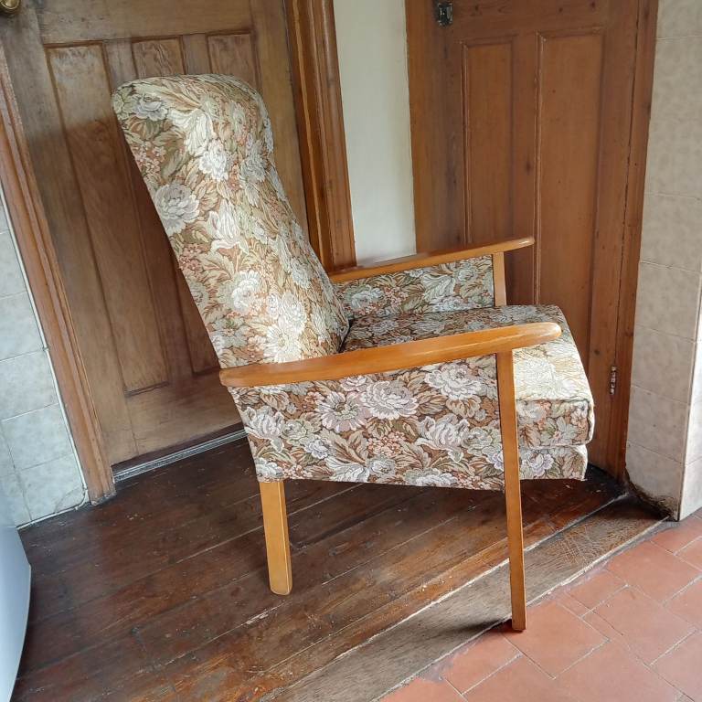 Comfy Armchair with High Back, floral cushion, wood legs and arms