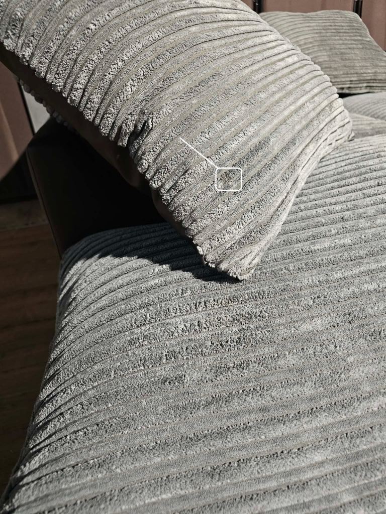 Less than two weeks old. Very good clean condition apart from one little mark on one of the back cushions (marked in photo) nothing noticeable. Can go in the corner so won't be seen. Otherwise still as new. Was in smoke free home.