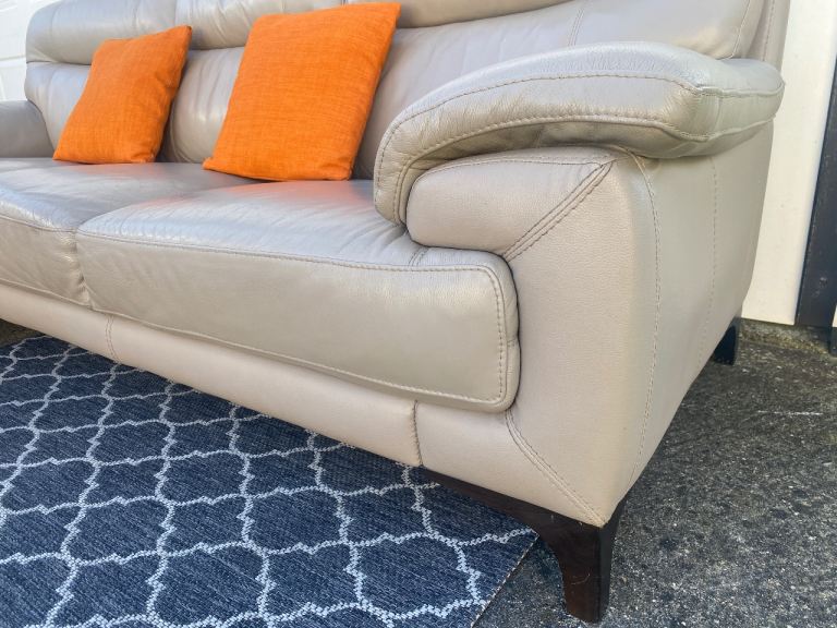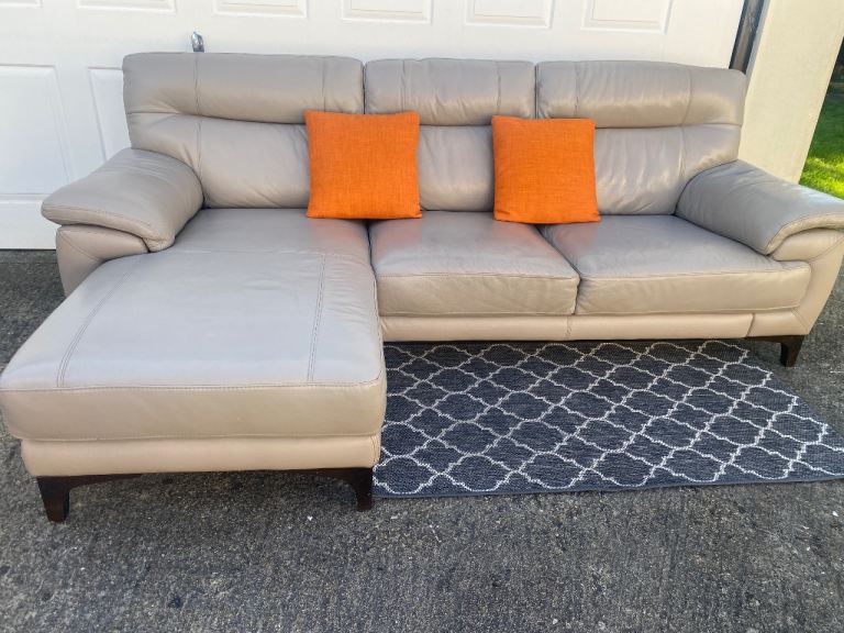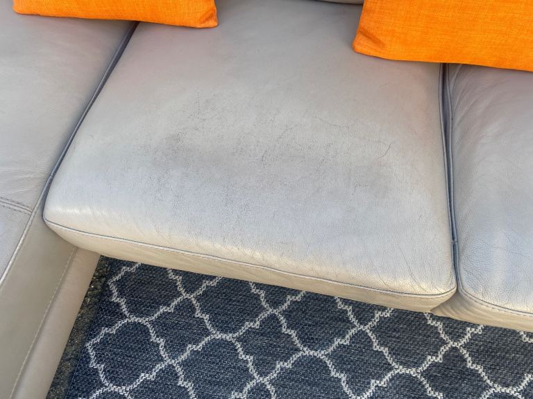 Corner sofa in good condition,leather ,clean, smoke-free home, 250 cm by 155 cm, h-80 cm, separates into two pieces, can deliver for an extra cost (small cushions are not included).
