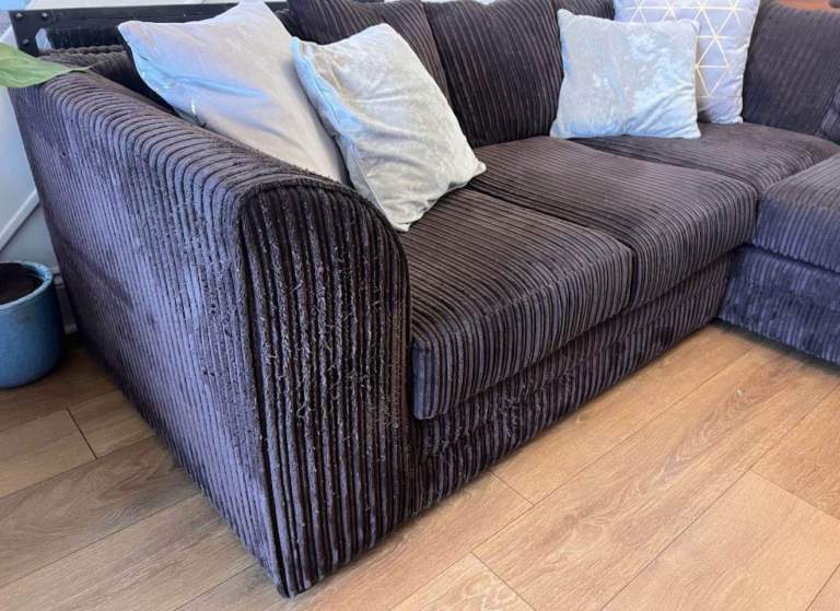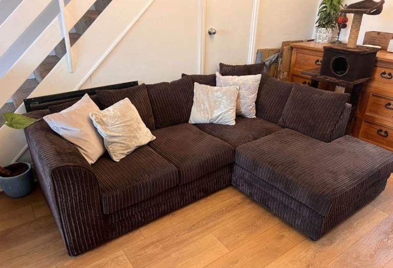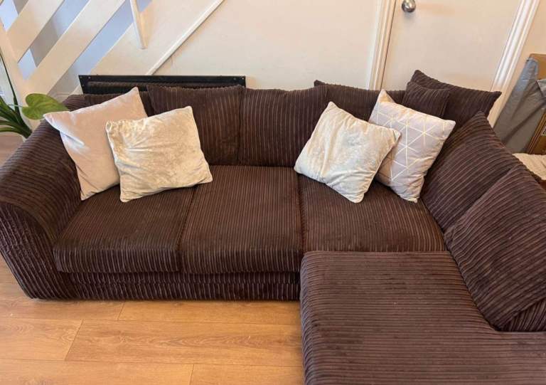Excellent condition brown corduroy corner sofa with a built-in chaise section for lounging. The jumbo cord fabric is incredibly soft and durable. Includes all the plush scatter cushions as shown (velvet, plain, and geometric pattern) for an instant styled look. A great sofa for spacious living rooms and maximum comfort. Dimensions available upon request.