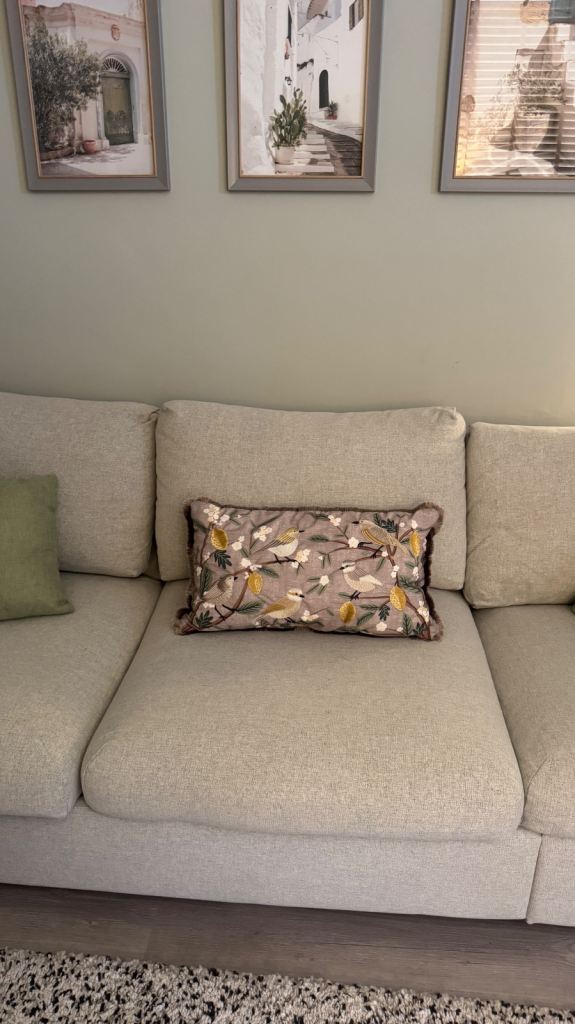 A comfortable and stylish beige cotton sofa, perfect for any living room. In good condition with some signs of wear, but plenty of life left. A great bargain for a quality sofa.