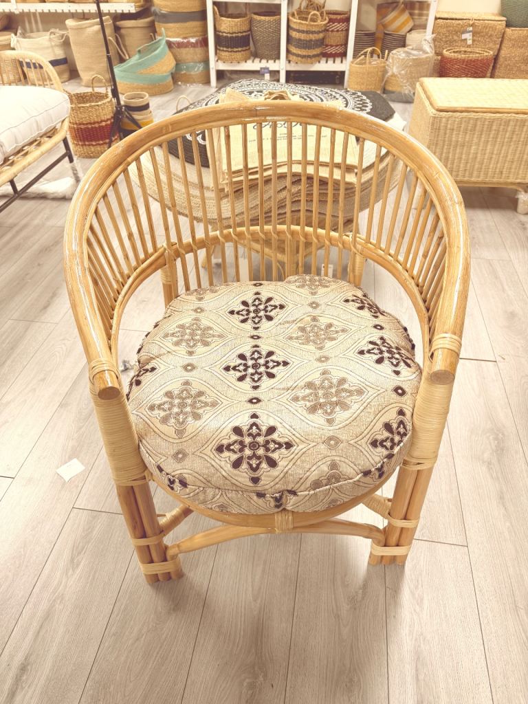 Hand made with cane very strong and comes with a cozy sitting cushion and cover.