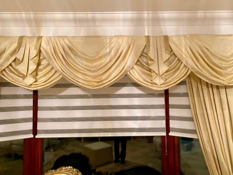 Great condition sofa suite chaise lounge cream gold Versace fabric matching chair available collection Peterhead matching swags tails curtains also available