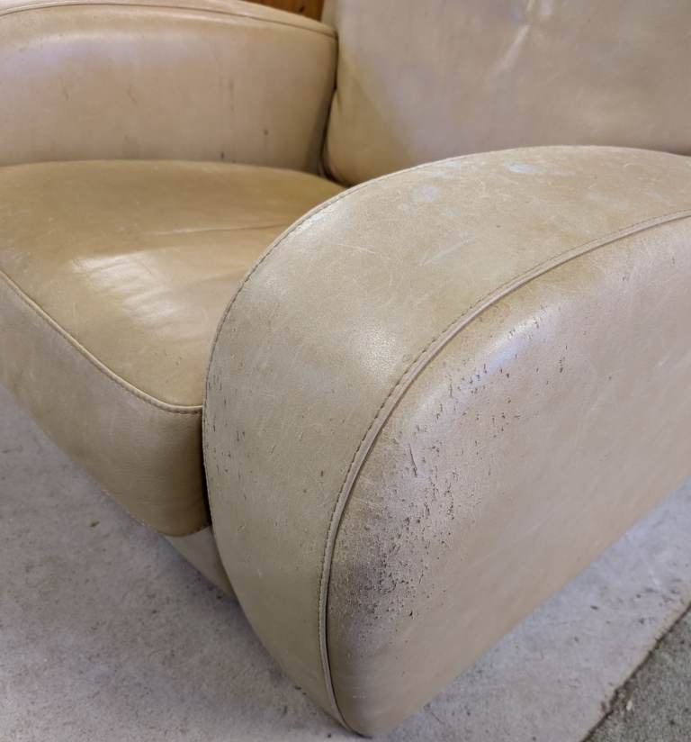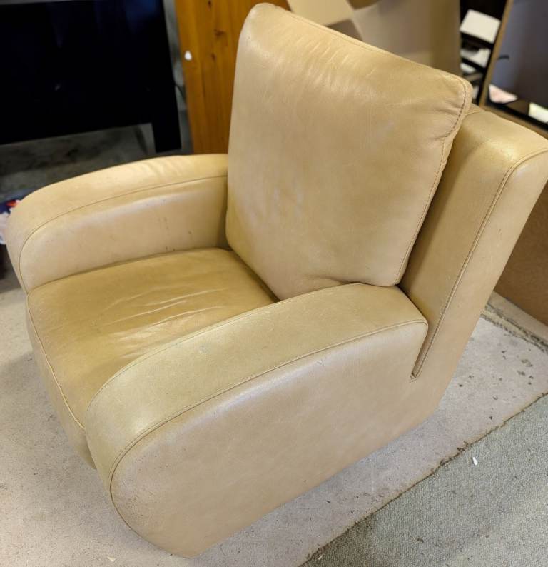 Cream leather armchair with fire tag some scratches from cats but could be recovered or used as is with a throw, having a clear out, shame to take it to the recycling, free to a good home. First to collect gets it, if the ad is still here it is still available.