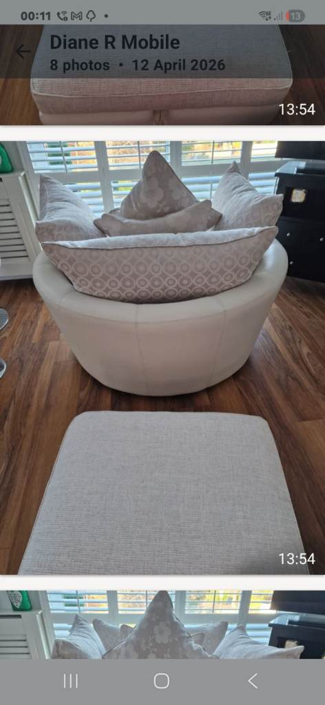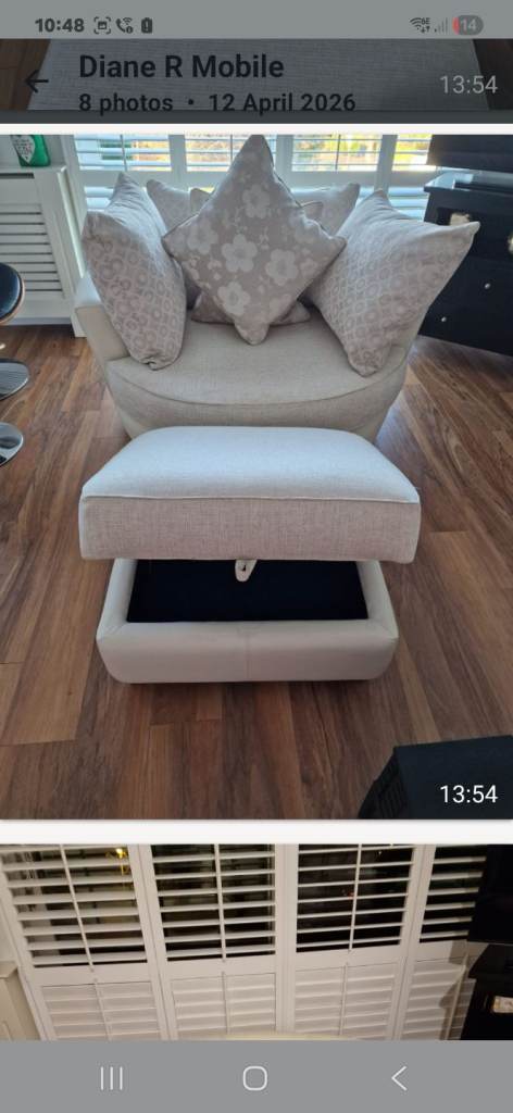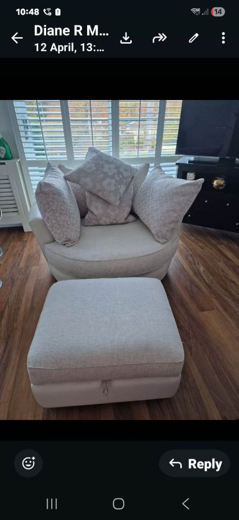 Professionally cleaned chair with 5 scatter cushions. Footstool has storage area.