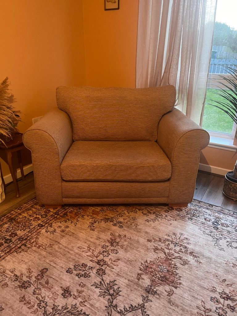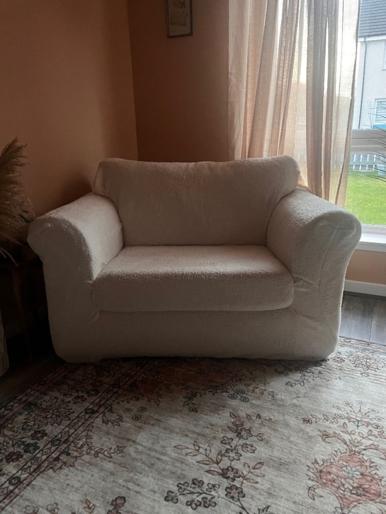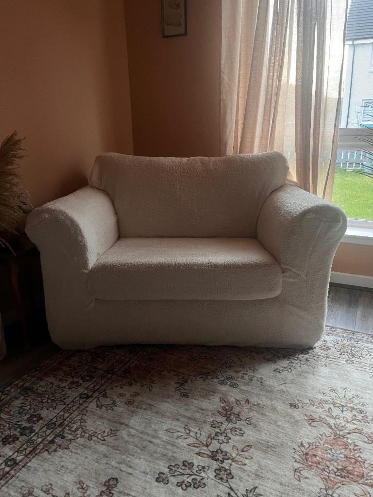 Large cuddle chair. In great condition. Bought from Next. Very clean comfortable. Only selling as no room with my new sofa. It’s like a waffle velvety material.I have a Teddy Fleece fitted sofa cover in cream which looks lovely on! Took as many photos as possible so you get a good idea of what it’s like.