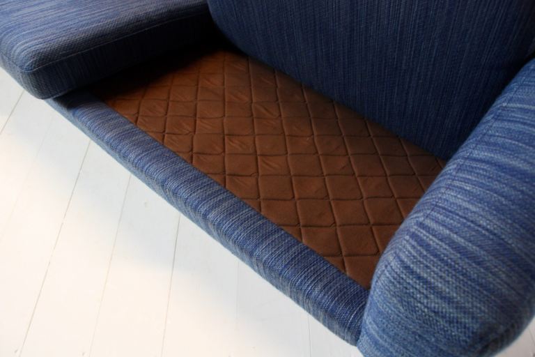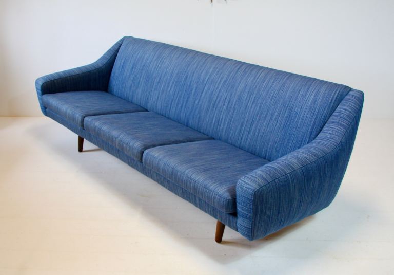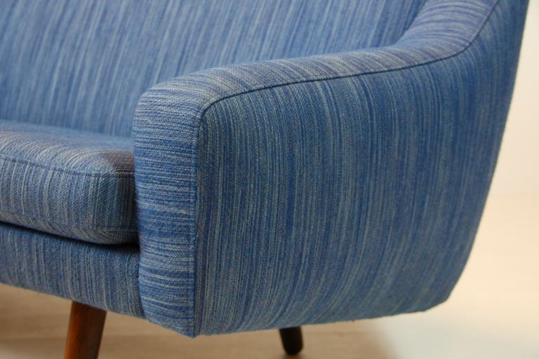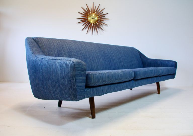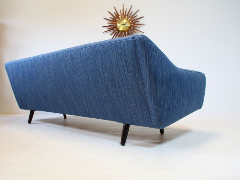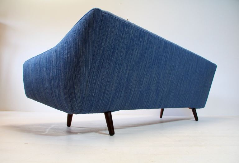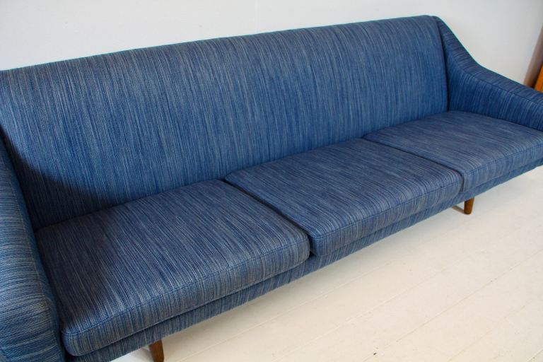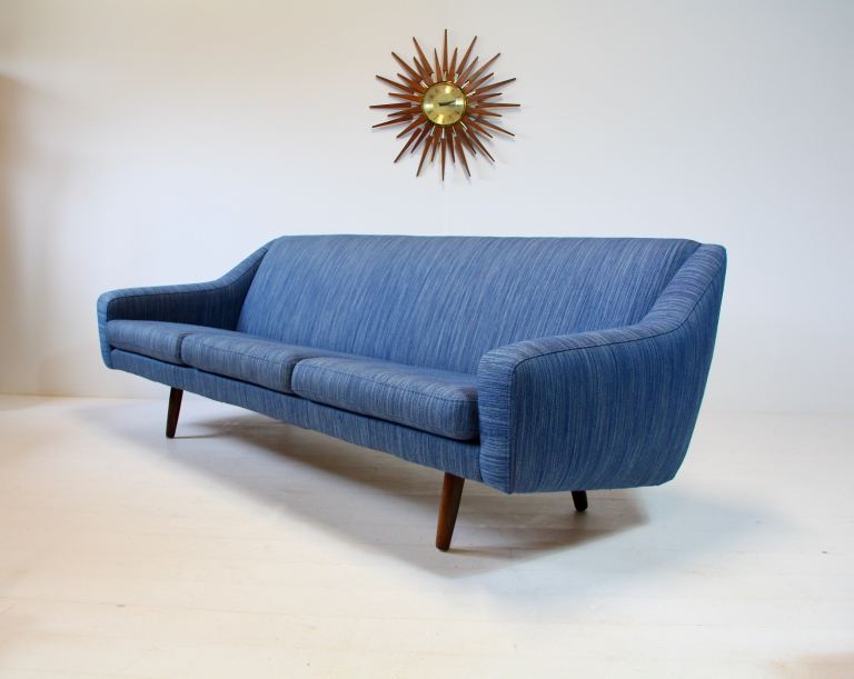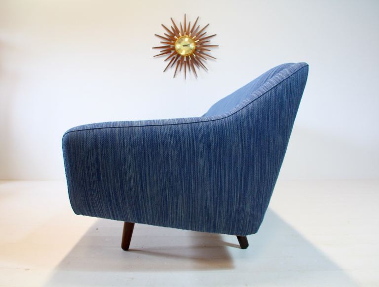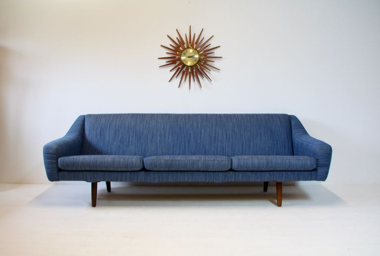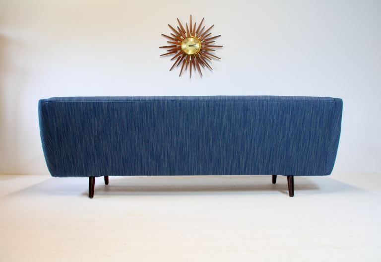 Stunning mid century sofa by Amager Bolighus (Denmark, c.1960). Fantastic timeless form with very comfortable proportions. One of the most comfortable mid century sofas we've had in stock. Sat on elegant solid rosewood legs which contrast beautifully against the blue fabric. A truly great mid century Scandinavian sofa for your home offered in showroom condition.