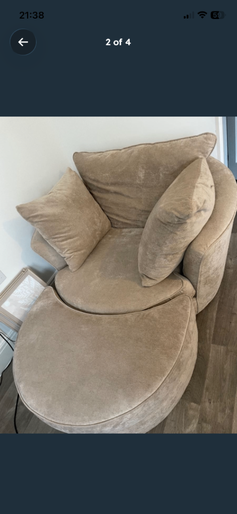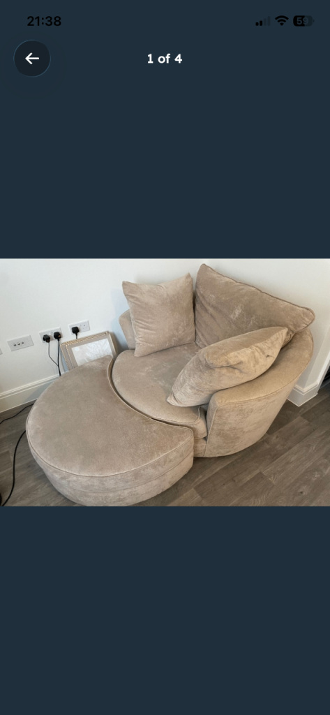 This stunning cuddle sofa which swivels is from DFS, just 5 years old with very little use so in very good condition. It comes with a foot stall that can be placed in front or to the side