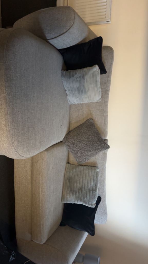 Grey couch from dfs with cuddle chair and foot stool
