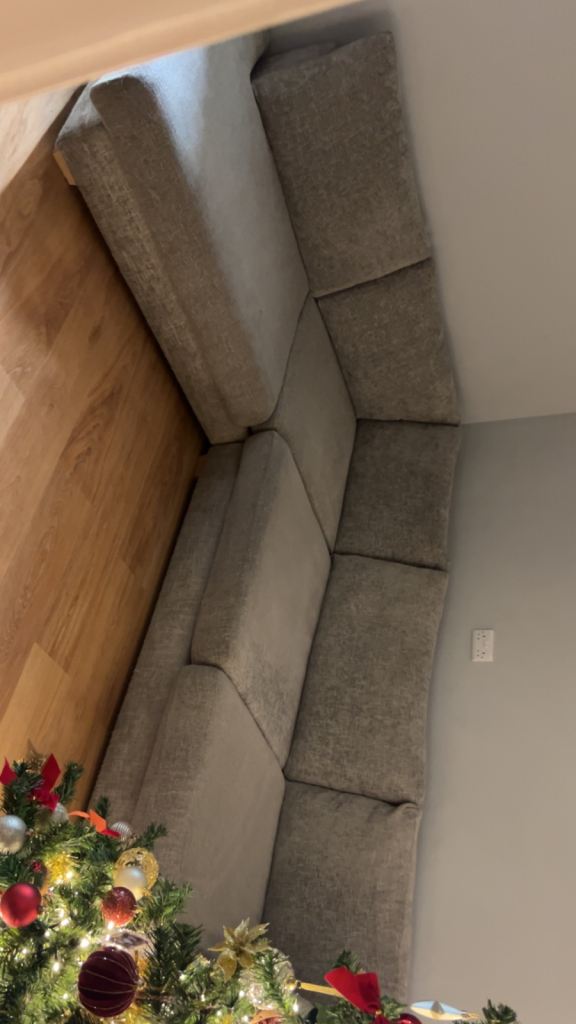 DFS Kaizer grey right hand corner sofa, pet/smoke free home. 227cm x 227cm