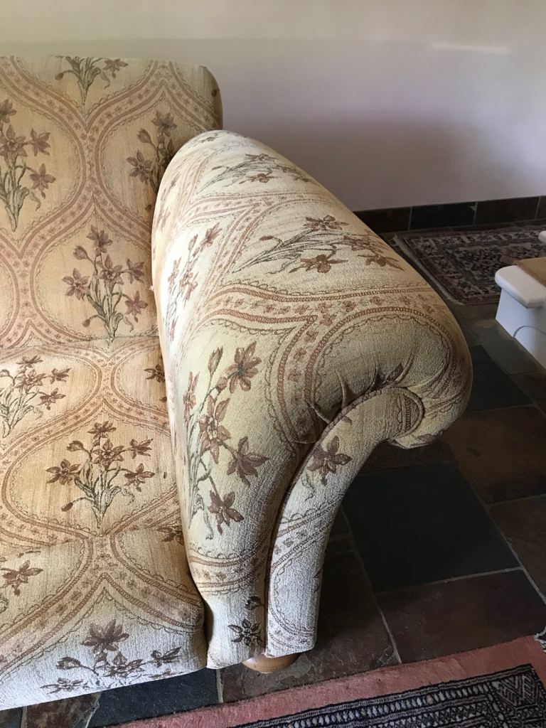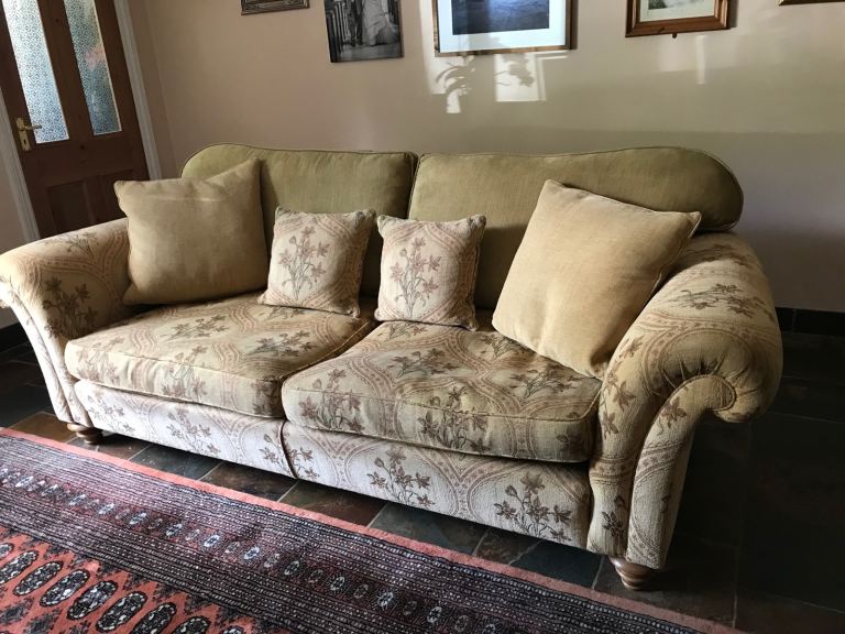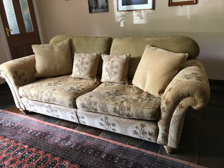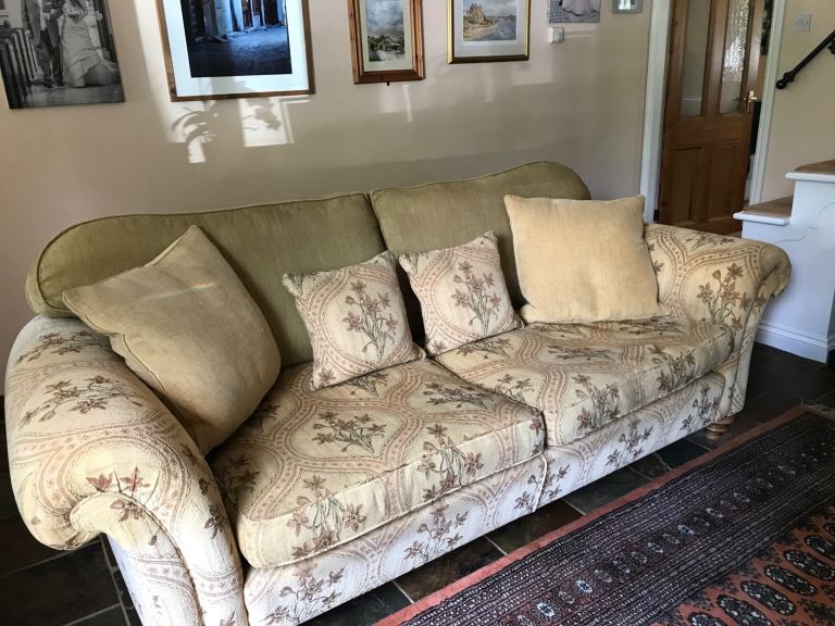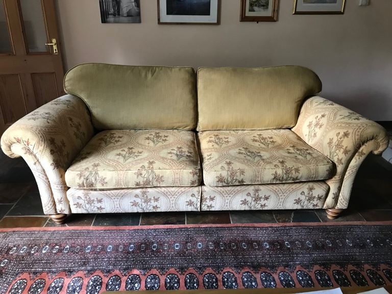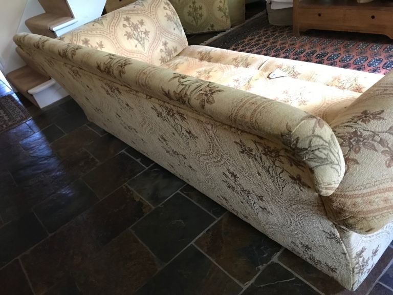 Duresta Grand Sofa 3to4 seater golden brown floral design, Stands in short turned wooden legs smoke free home