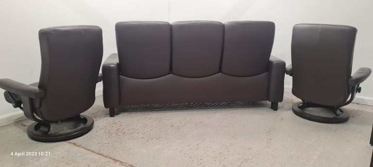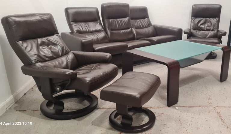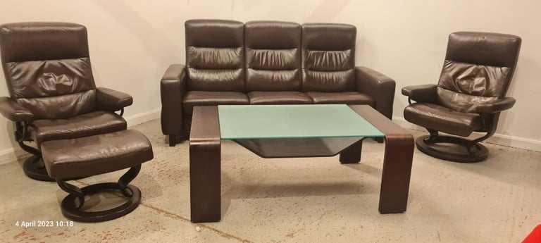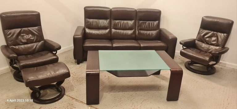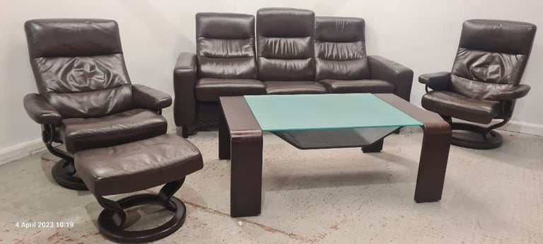 kornes Stressless 3 Seater, 2 Chairs with Footstool and Matching Glass topped coffee table