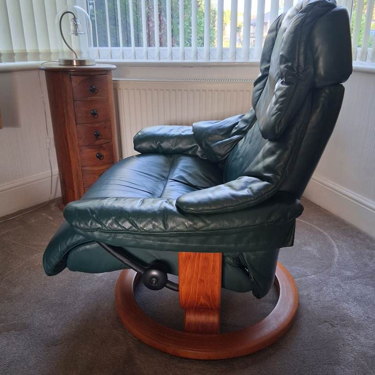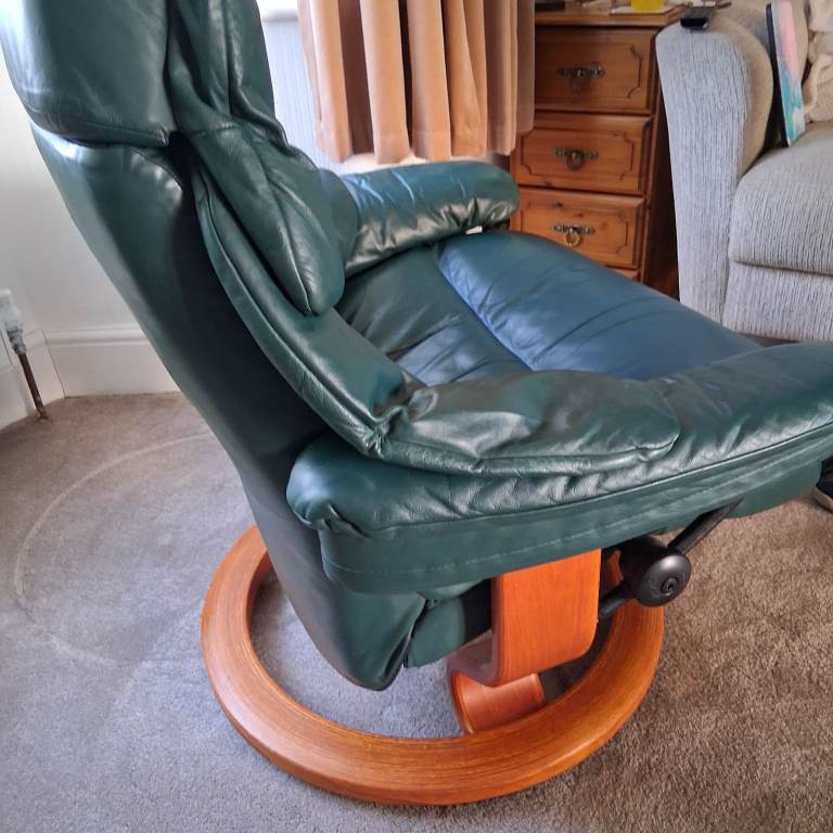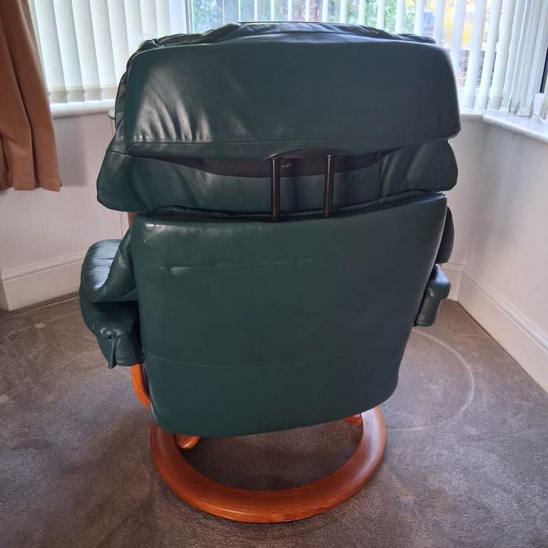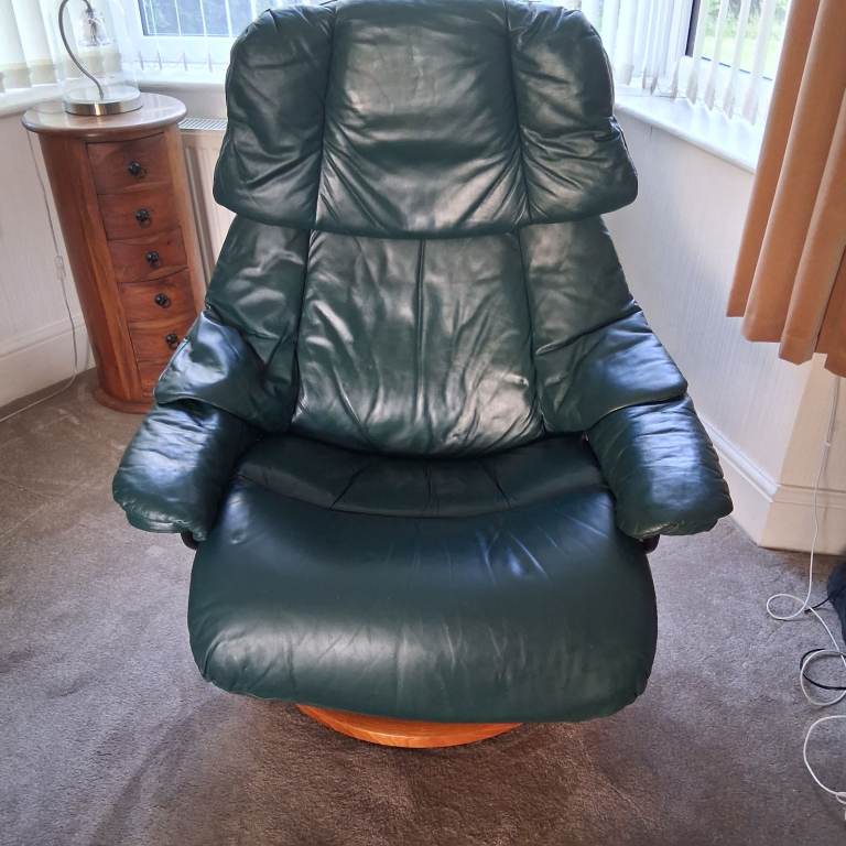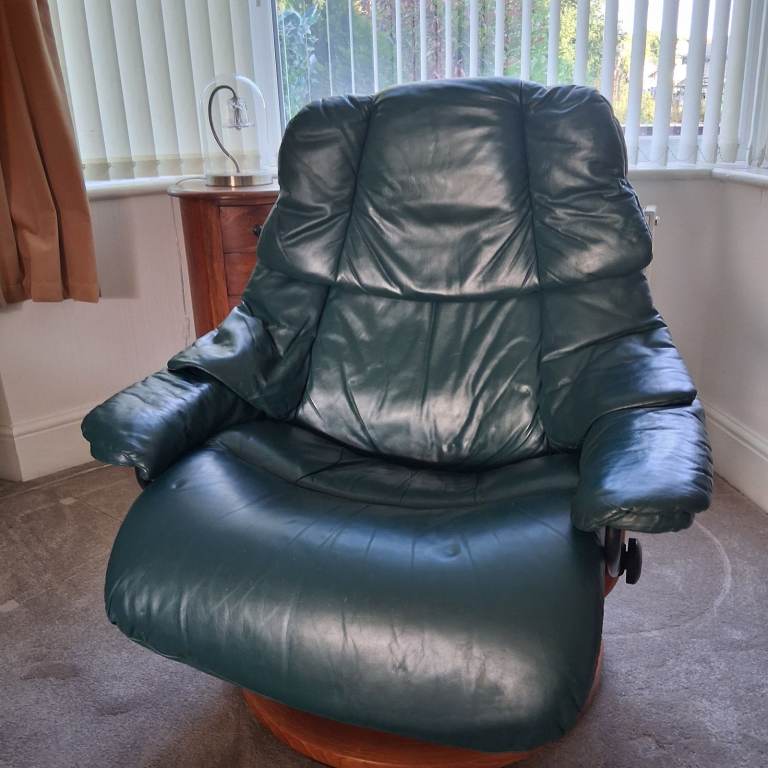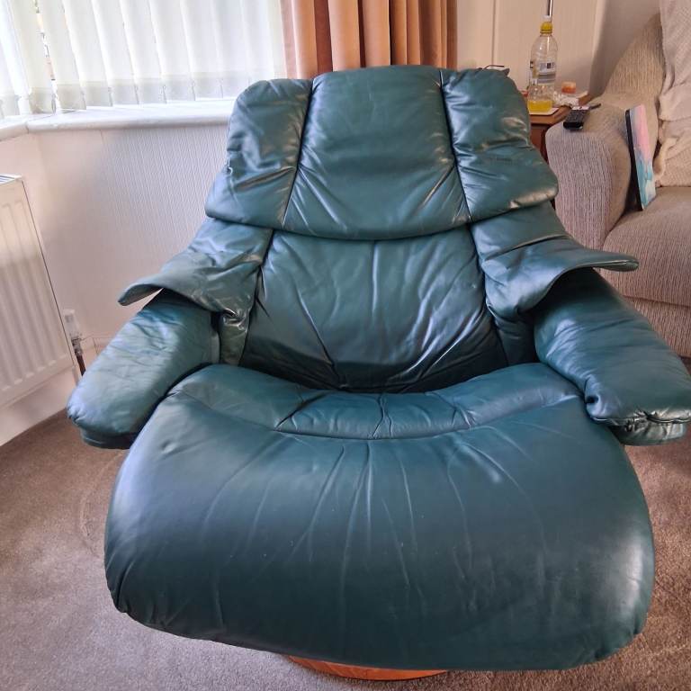 Large ekornes reno in aqua green leather in very good condition. Reclines and swivels with the classic base in light wood. Cash on collection please.