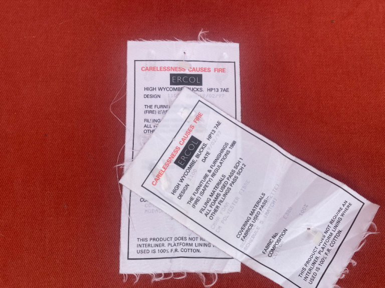 - Upholstery in Ercol red fabric and cushions in Ercol light checkered patterned fabric