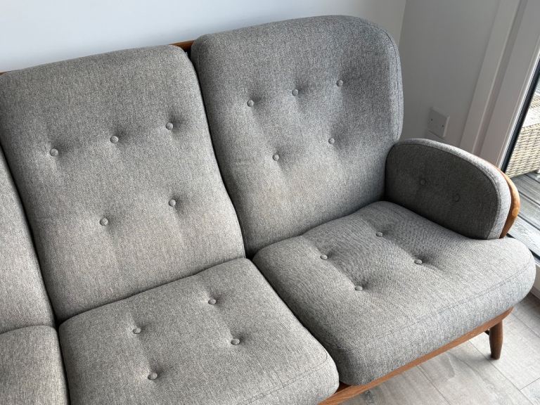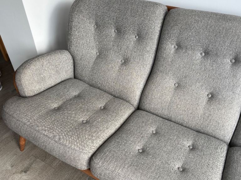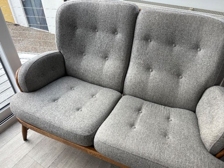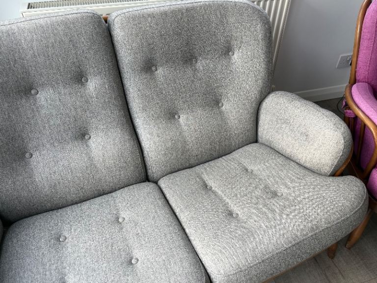 Both sofas professionally recovered in grey marl hard wearing upholstery fabric.