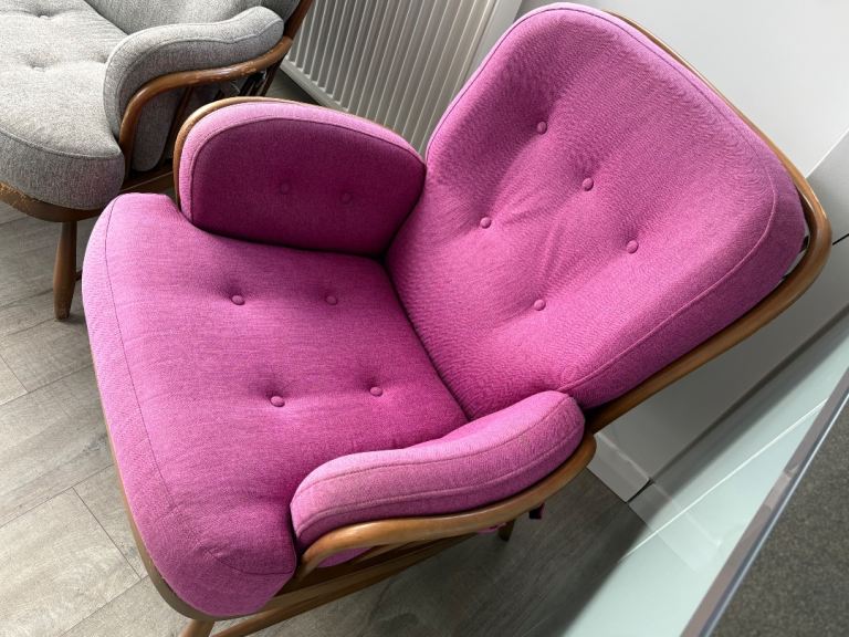 One armchair professionally recovered in pink hard wearing upholstery fabric.