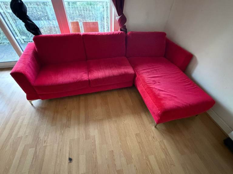Comfortable red L-shaped corner sofa in good used condition. Soft fabric with firm cushions, ideal for living rooms or flats. The chaise section is perfect for relaxing or stretching out. Structurally solid