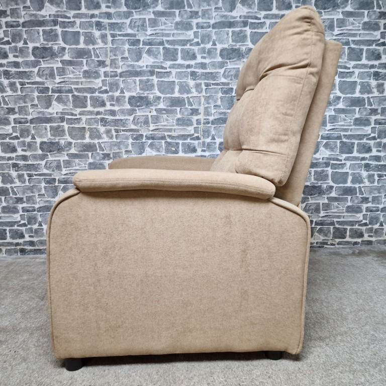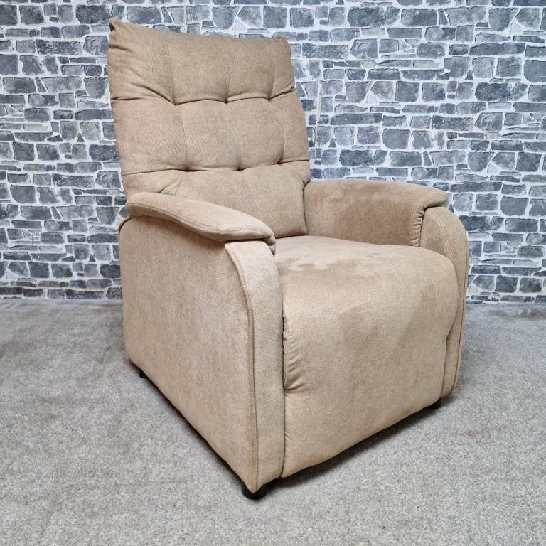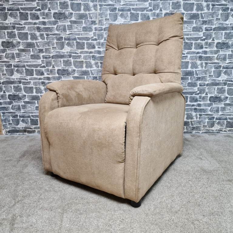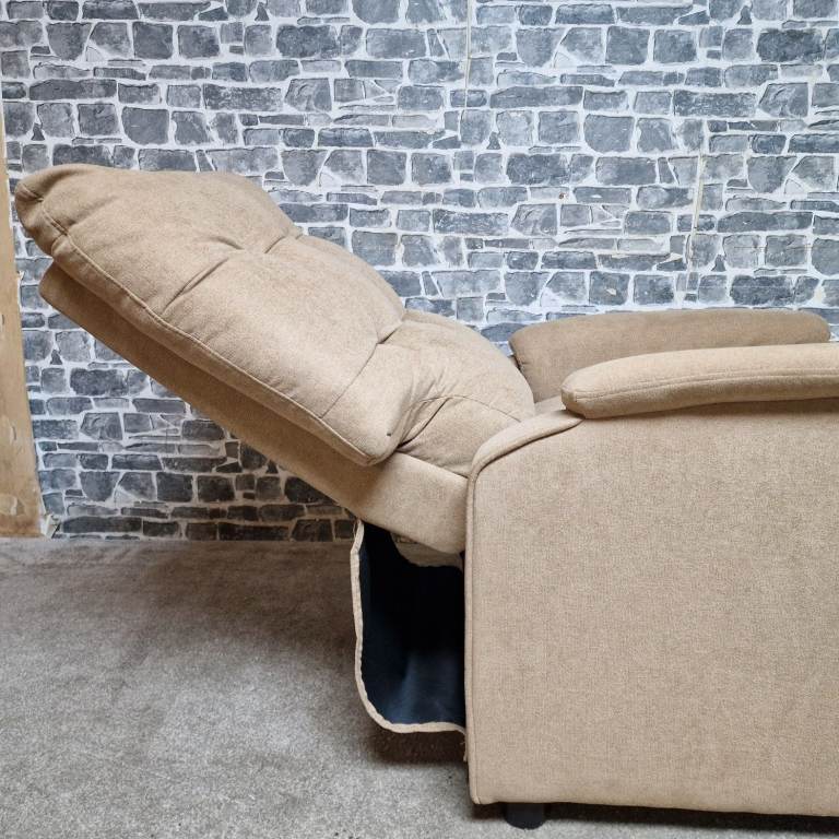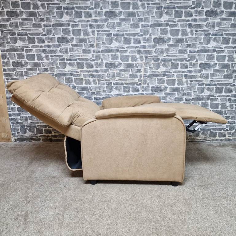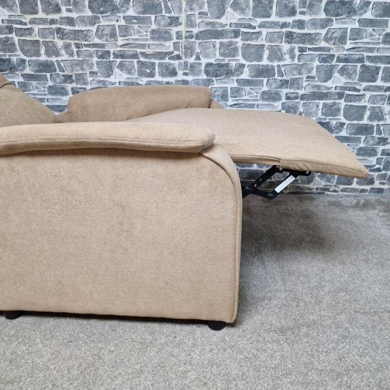 Very comfortable recliner chair with soft fabric upholstery and padded arms. Easy manual recline with footrest for relaxing. In good condition and works well.