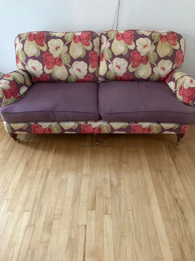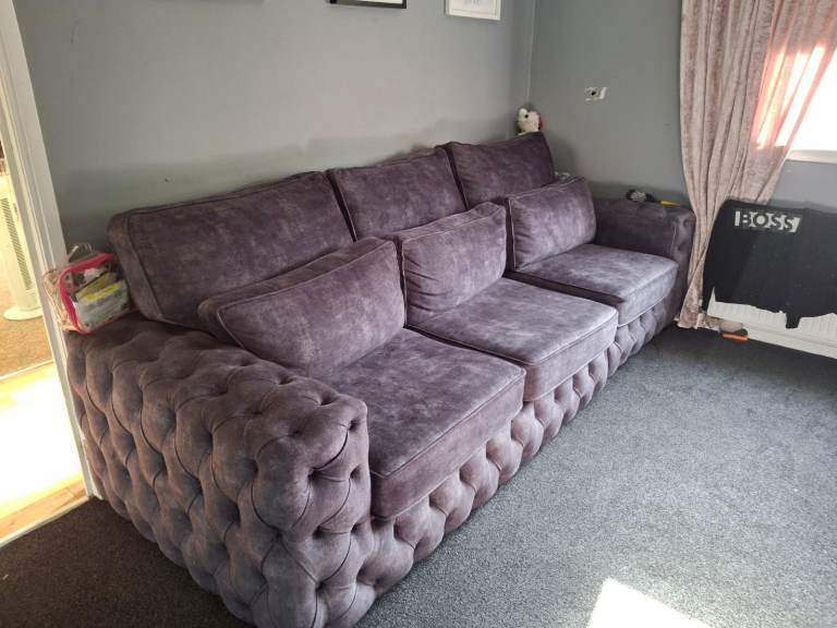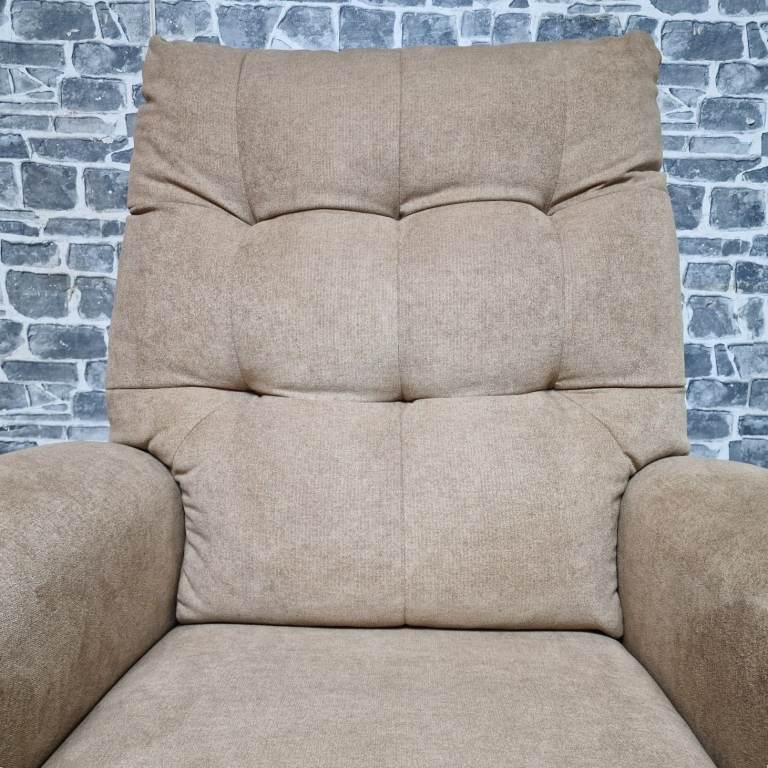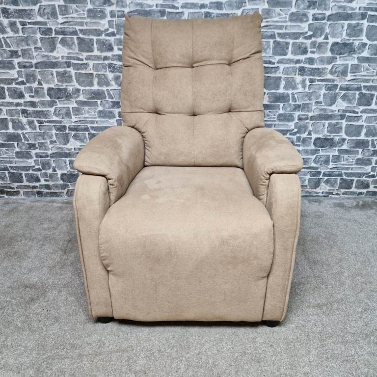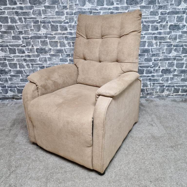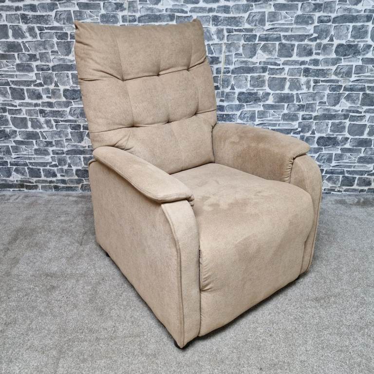 Very comfortable recliner chair with soft fabric upholstery and padded arms. Easy manual recline with footrest for relaxing. In good condition and works well.