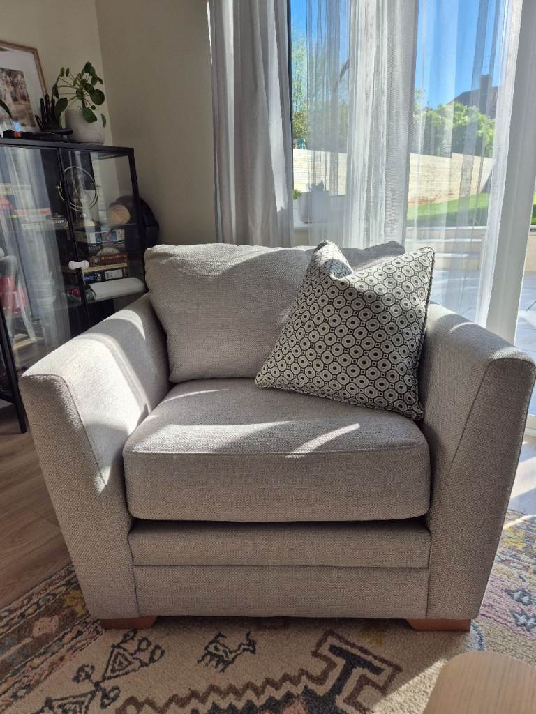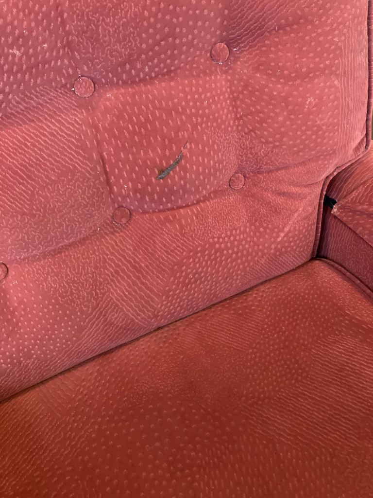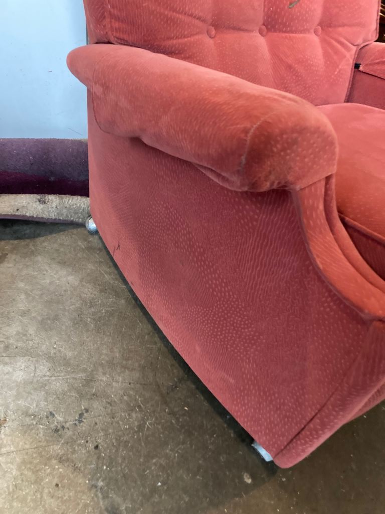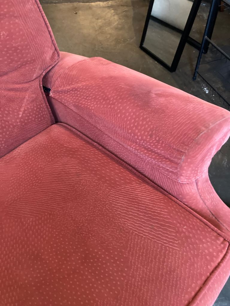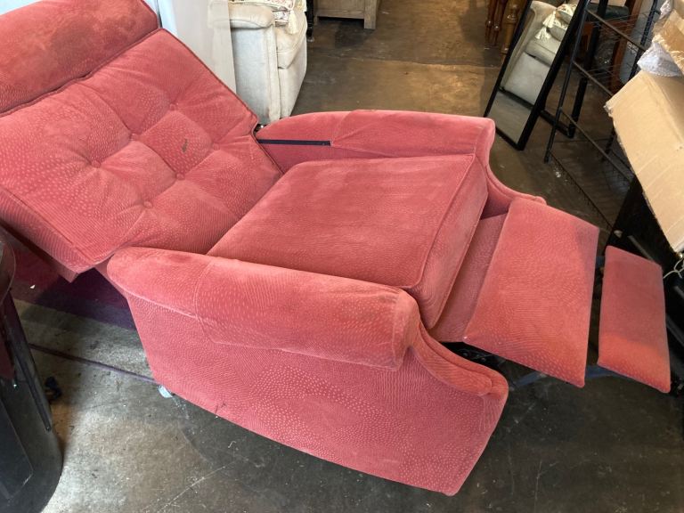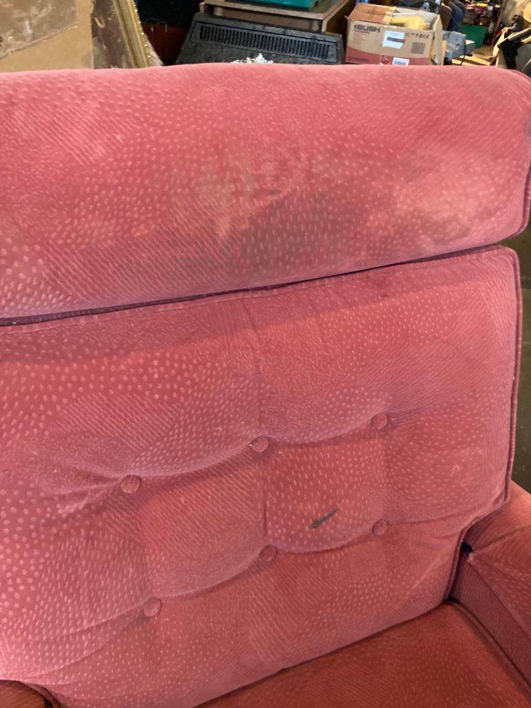 Fabric manual reclining armchair. Some marks on fabric as seen in photos. Don’t see any rips or tears to fabric