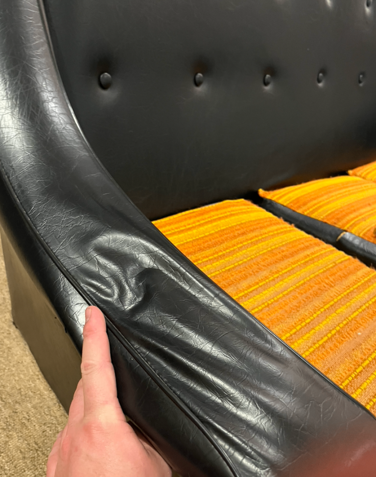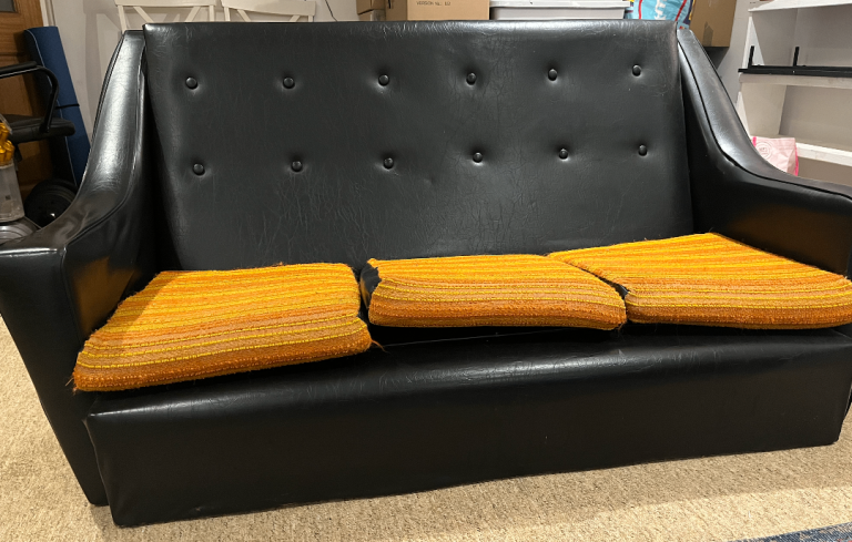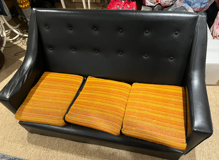 The sofa is in good condition overall; the cushions that come with it are slightly threadbare/ worn in places, but in decent condition still. The left arm support has broken but its not too noticable. Please see photos!