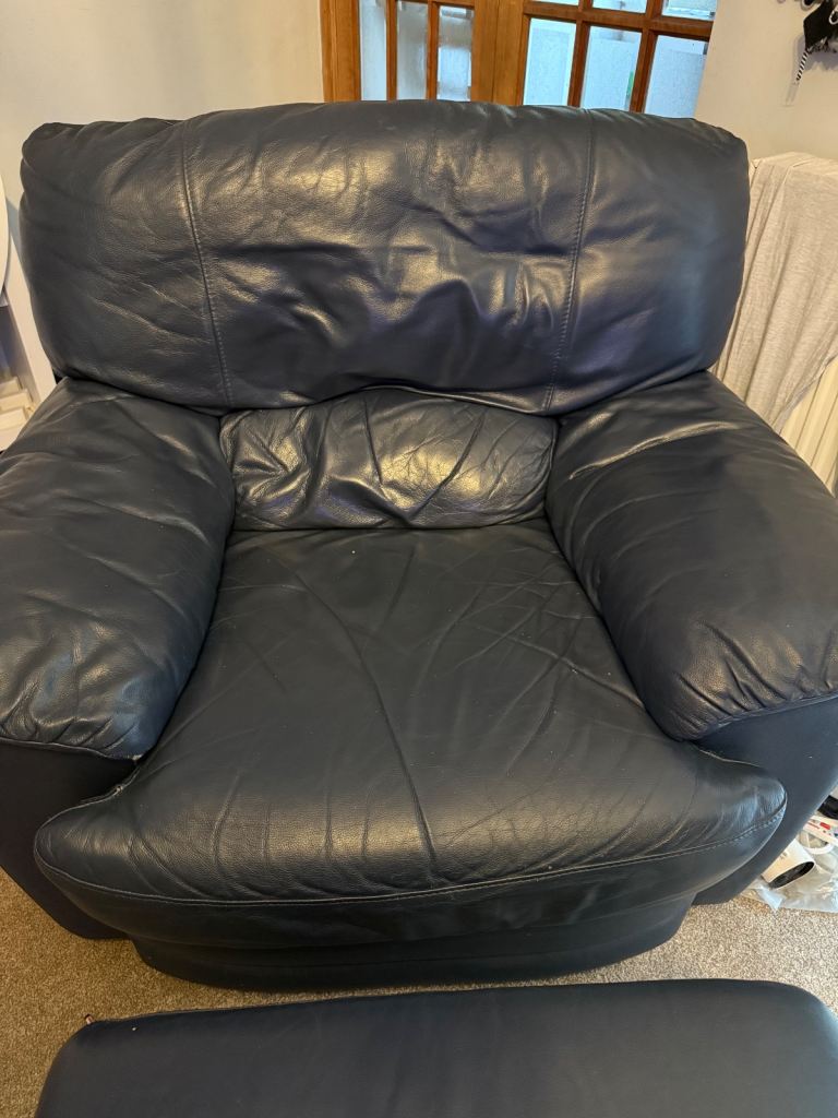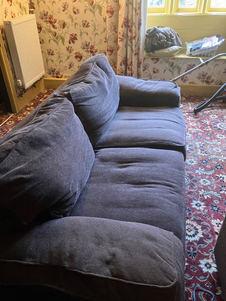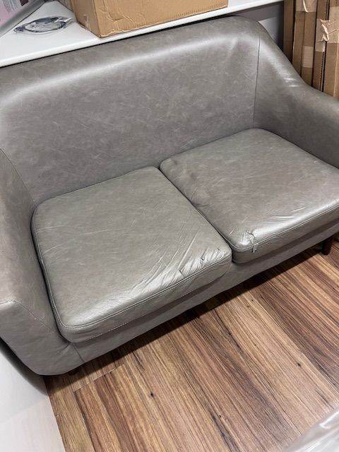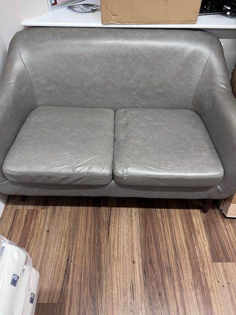 FREE - Dark grey faux leather 2-seater sofa. No problems with it expect that the faux leather upholstery has some small tears and is coming off on the front part of the cushions.