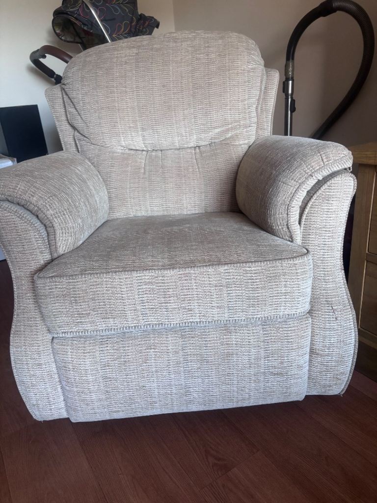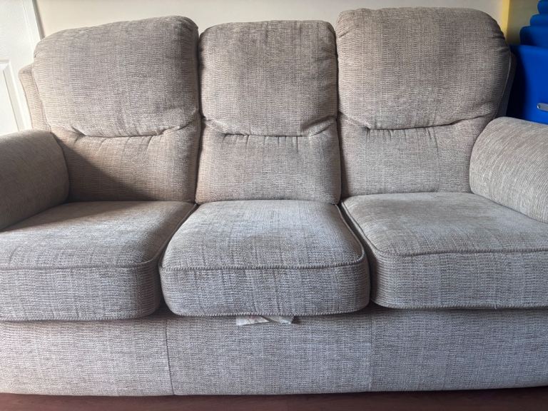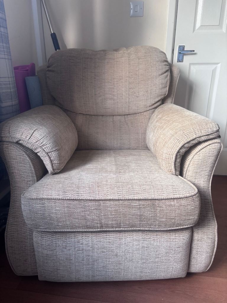 Consists of one three seater sofa two arm chairs 1 is an electric recliner which needs a new lead the other is just a standard arm chair