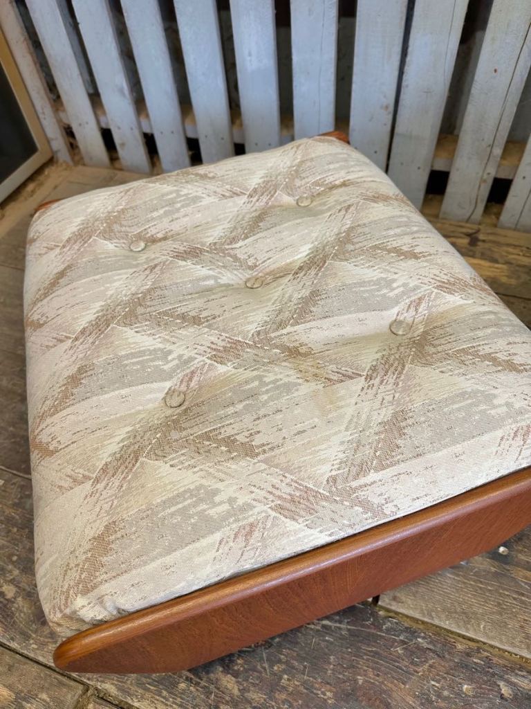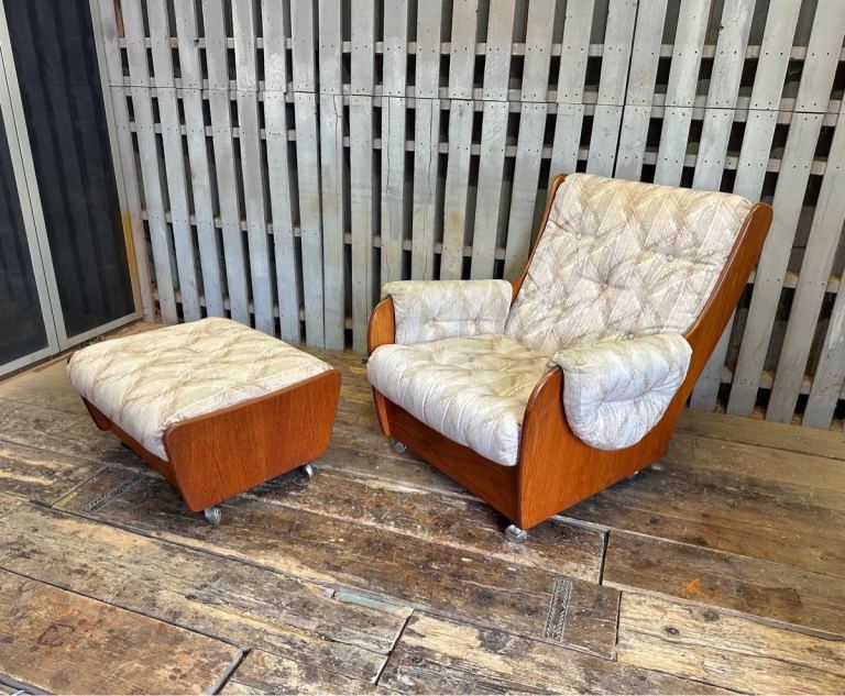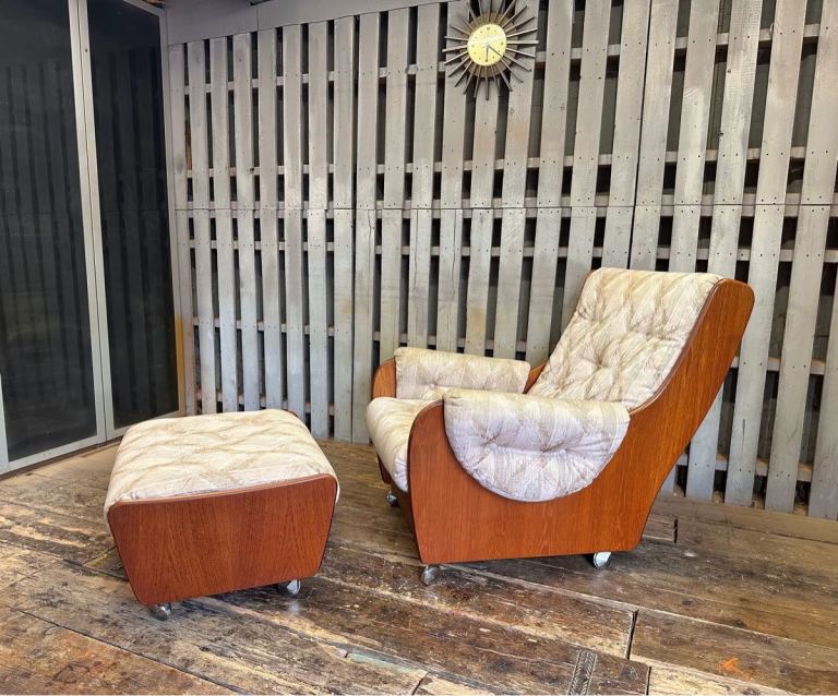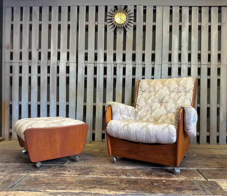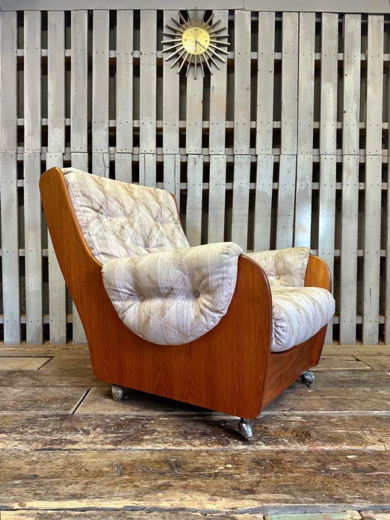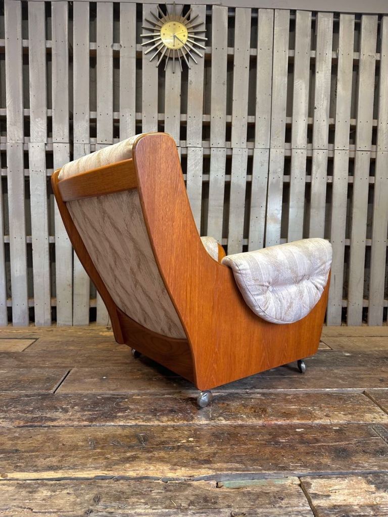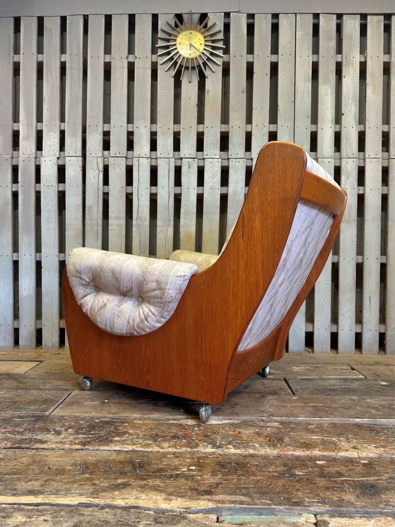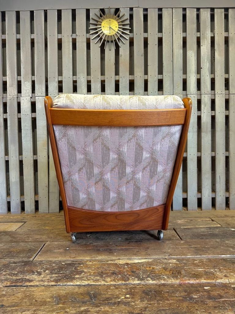 Very cool G Plan saddle chair and footstool , it’s teak framed with a patterned fabric and sat on castors. Really nice set
