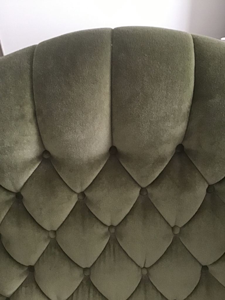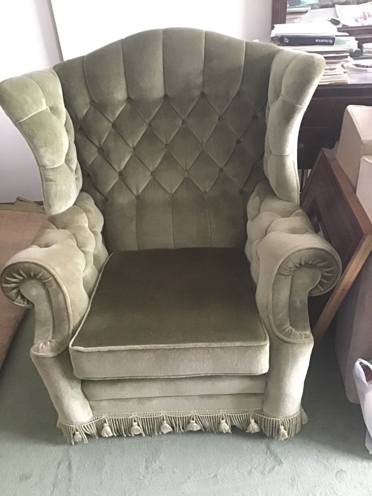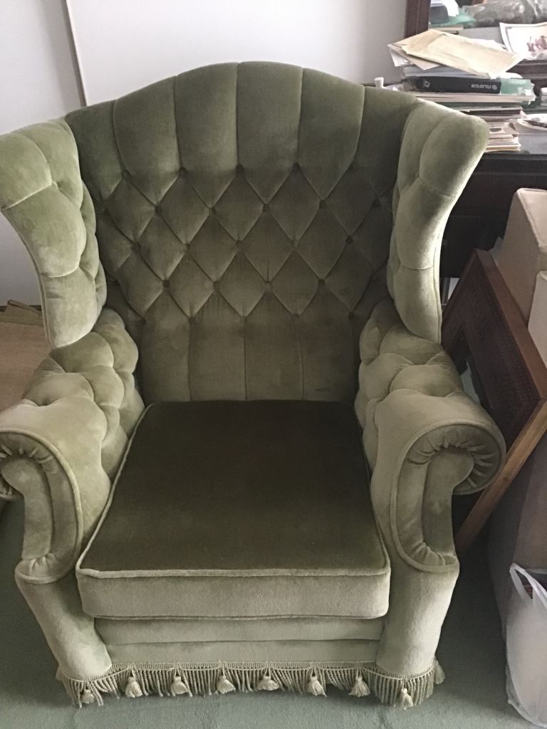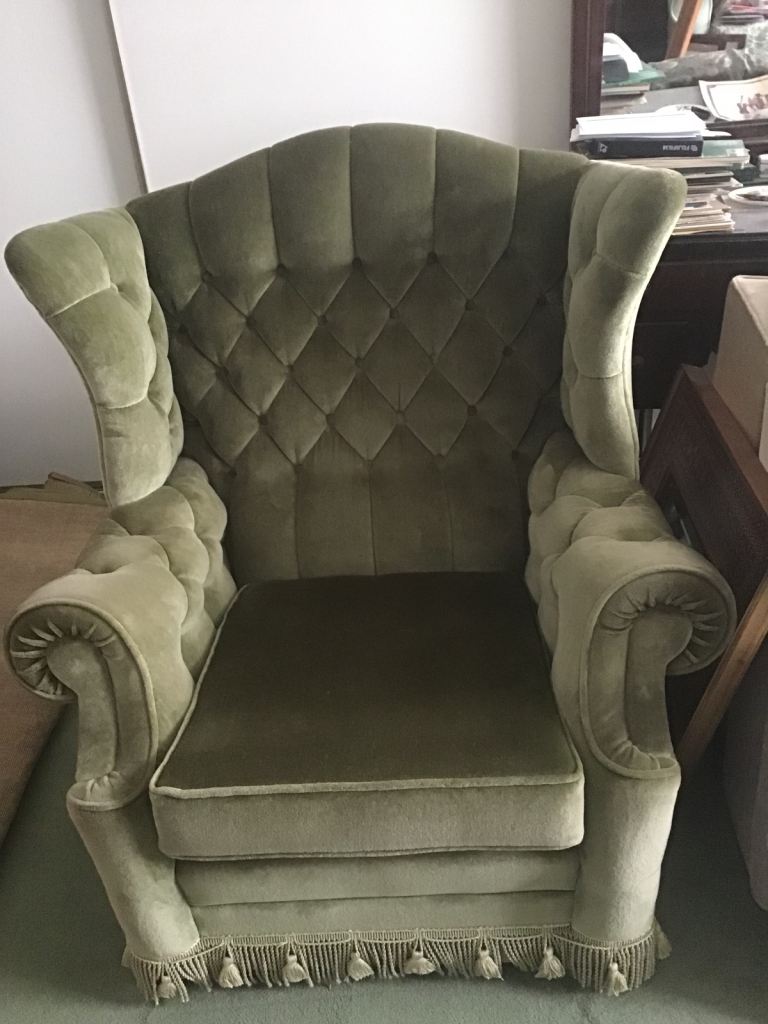 Beautifully upholstered in green dralon (like velvet) fabric. With zipped seat cover. Back, arms and wings are deeply “buttoned” in a diamond pattern, giving a luxurious look.