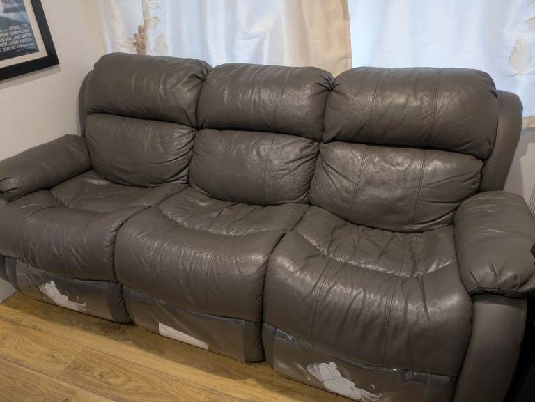 Grey leather recliner sofa, pay attention to diagram shown on the leg of sofa photo, only 2 seats are recliners. They both are functioning.