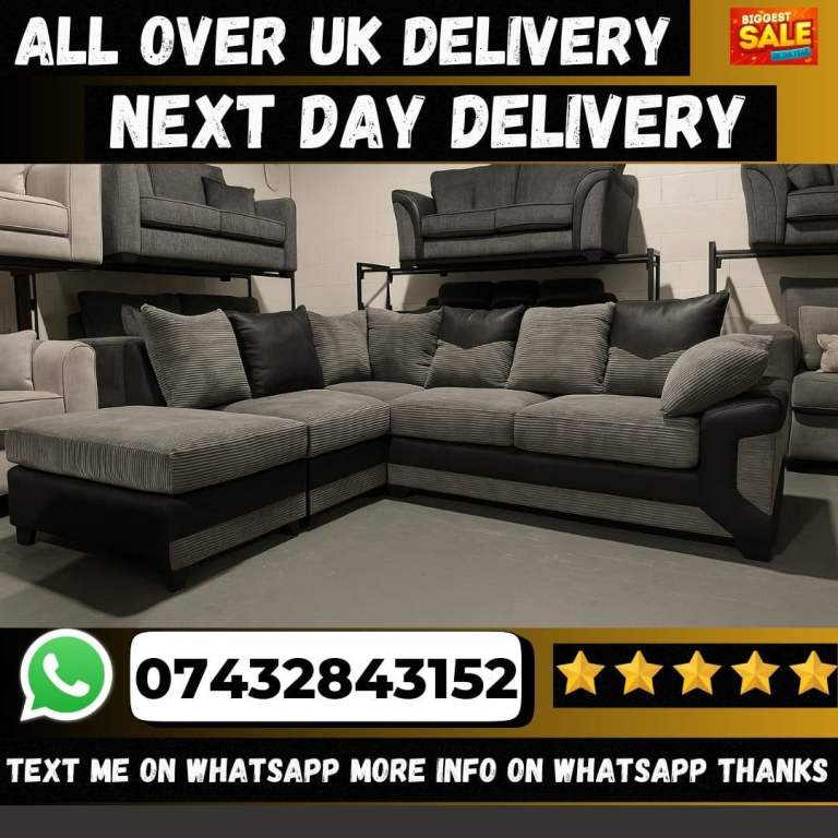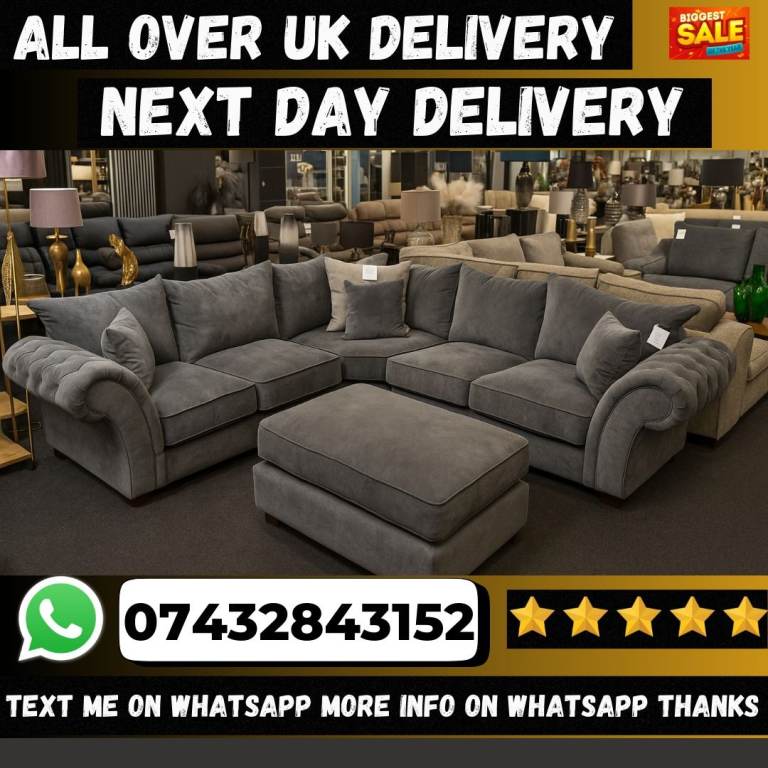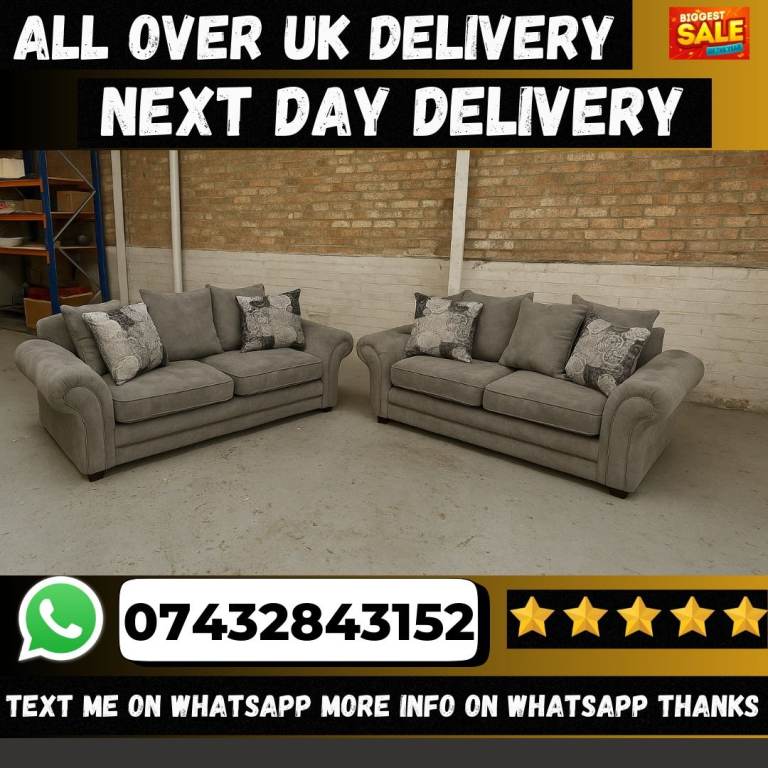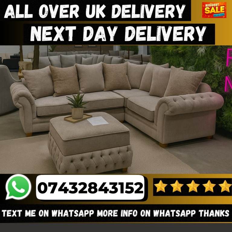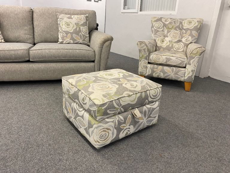 Oatmeal fabric and floral match sofa set with matching storage footstool.