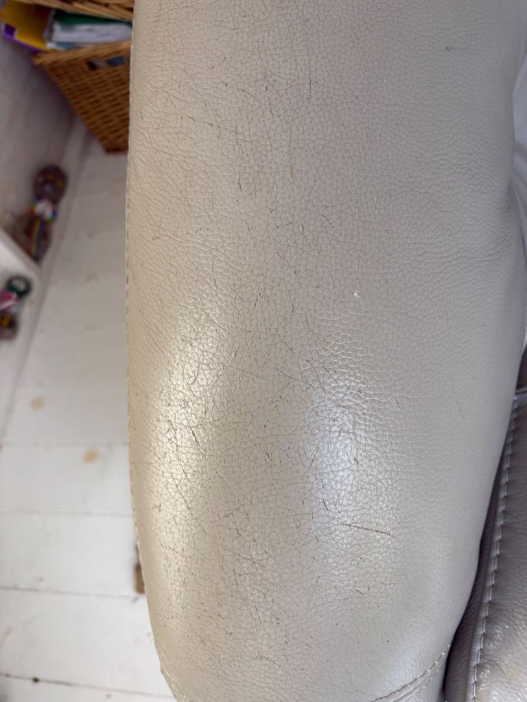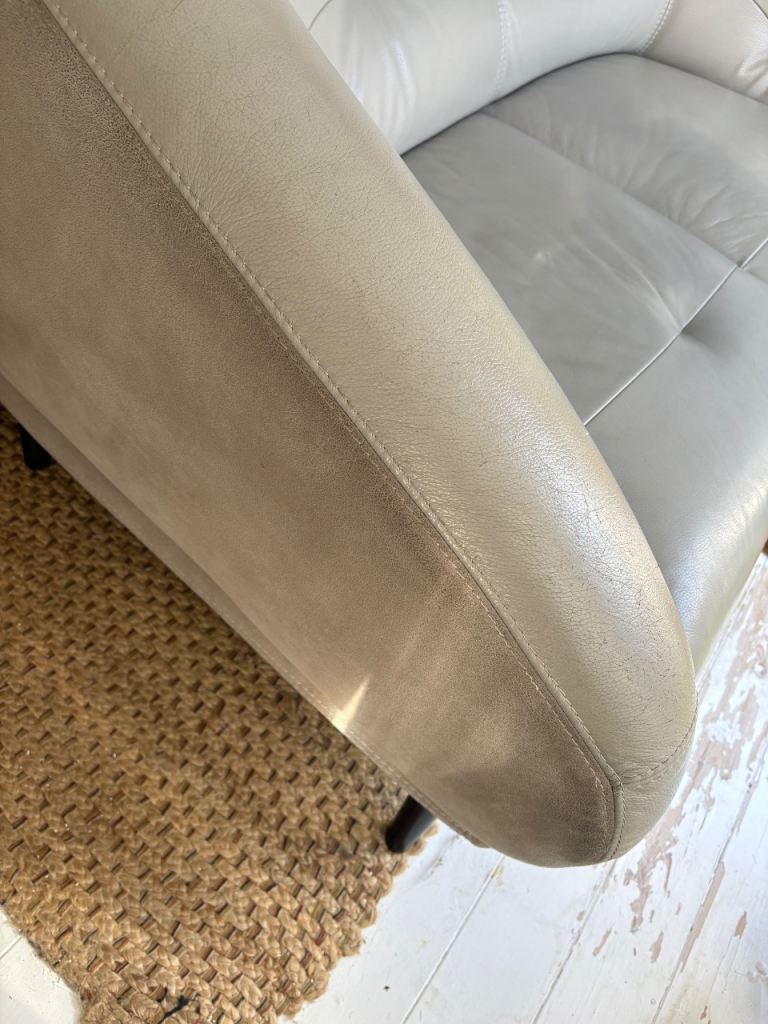 Showing signs of wear, some cracking on the armrest as shown in the picture.