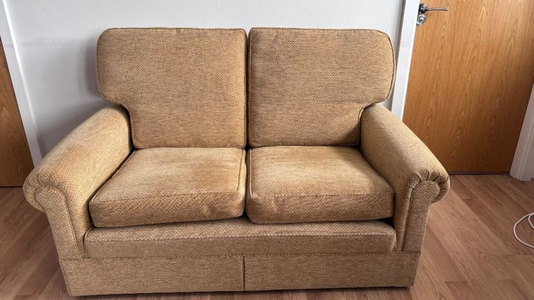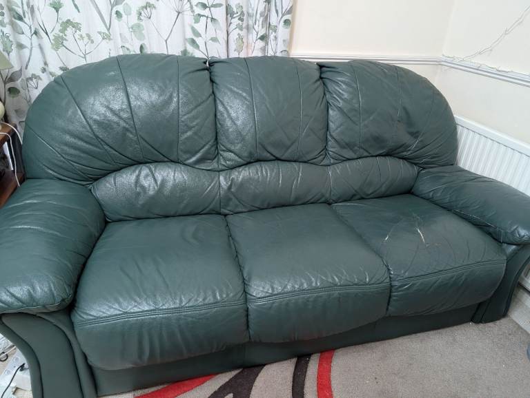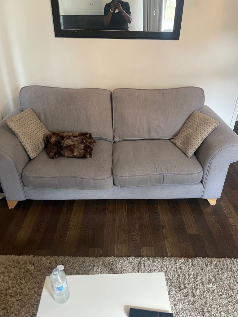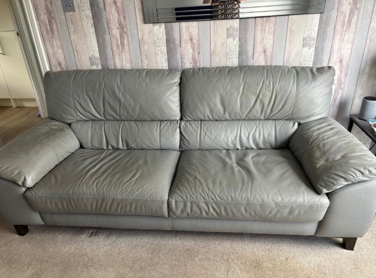 Lovely grey two-seater leather sofa, ideal for a smaller living space or conservatory.