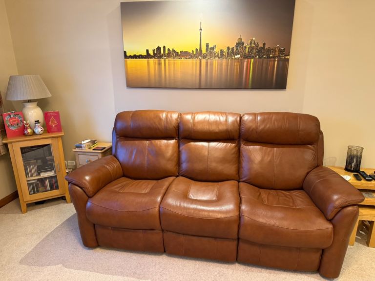 Quality leather 3 + 2 seat sofas. Both outside seats of 3 seater sofa are electric recliners and also have a USB PORT at each side. On sale in Sterling Furniture for £2900 for both. Looking for £1500 ono. Pictures show our suite in situe and the 3 seater in Sterling now. Pick up from bridge of Don.