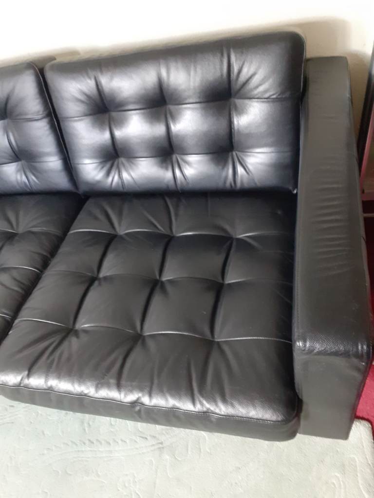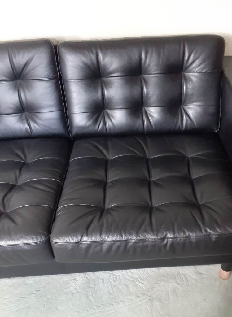 AS NEW IKEA LANDSKRONA SOFA IN BLACK, TWO SEATER (WILL SEAT THREE FOUR) REMOVABLE SEATS AND BACK CUSHIONS, LEATHER ANY INSPECTION FULLY WELCOMED, GENUINE BARGAIN EASY TRANSPORTING AND ONLY EVER USED VERY OCCASIONALLY IN SPARE ROOM NO PETS NO KIDS, FROM NON SMOKING HOME, PLEASE SEE IKEA SITE FOR FULL DETAILS AND PRICE ETC, NEED SPACE HENCE VERY CHEAP PRICE. SAVE OVER £350 BY BUYING THIS LOVELY SOFA. SIZES AS FOLLOWS, 164CM WIDE X 89CM DEEP X 78CM HIGH, £325 ono. IKEA PRICE £699, HAVE A LOOK..
