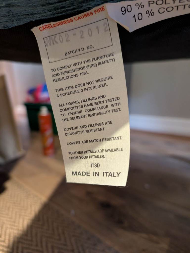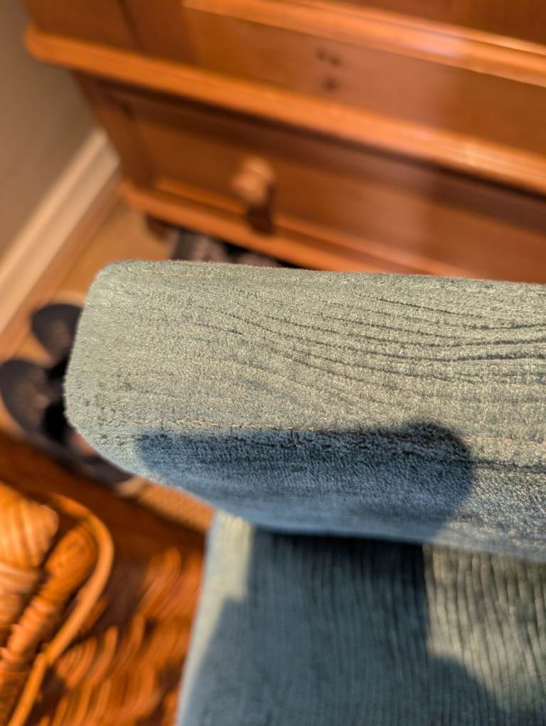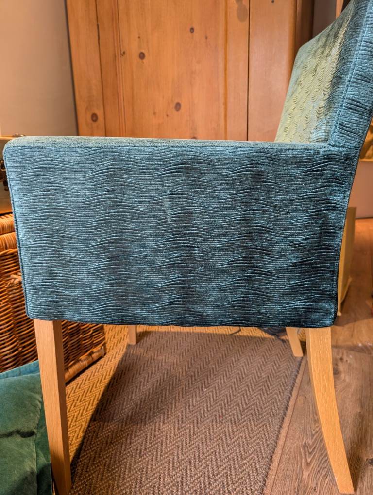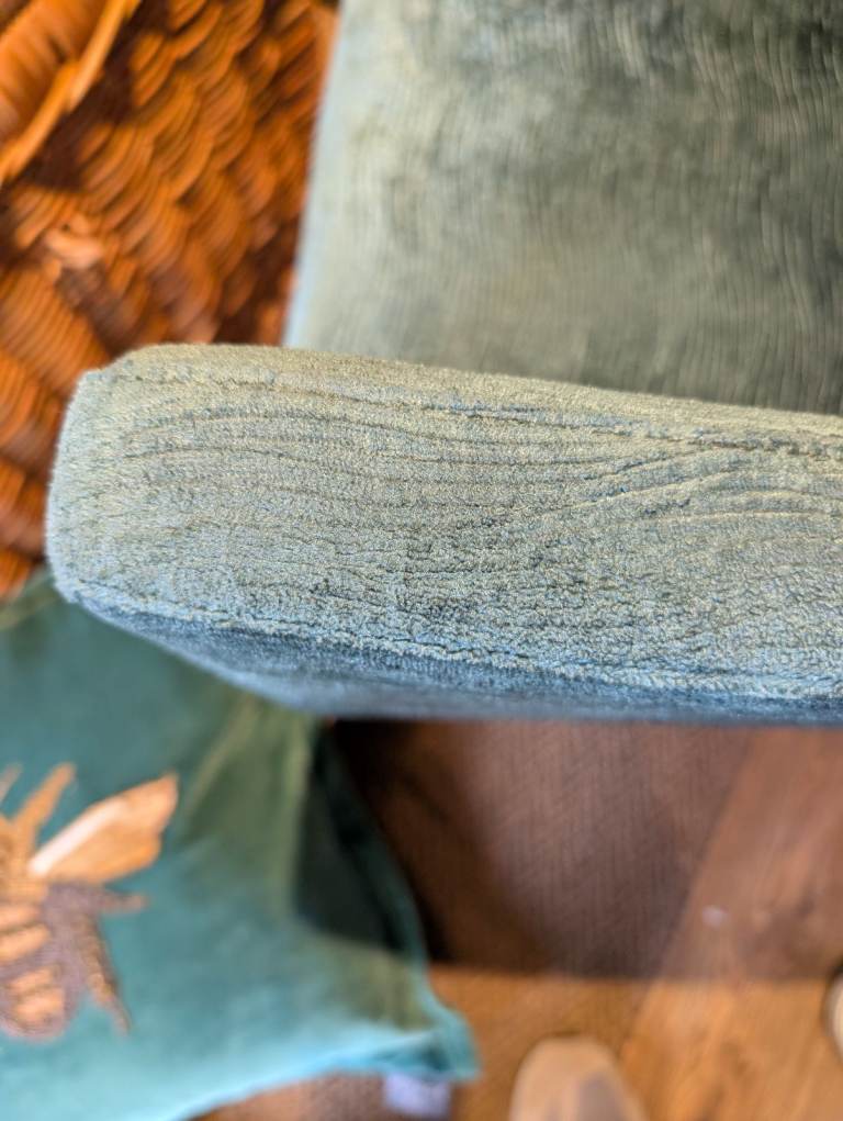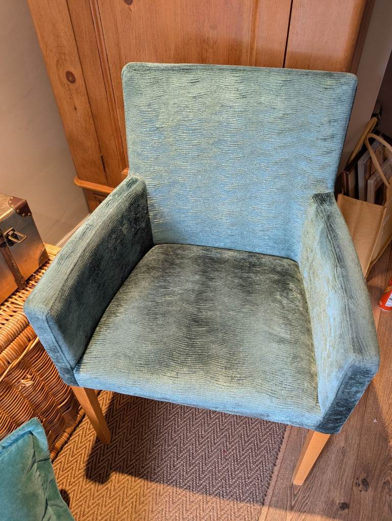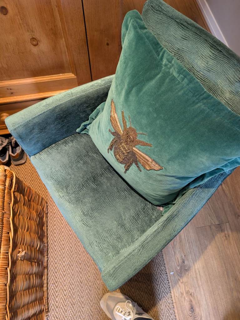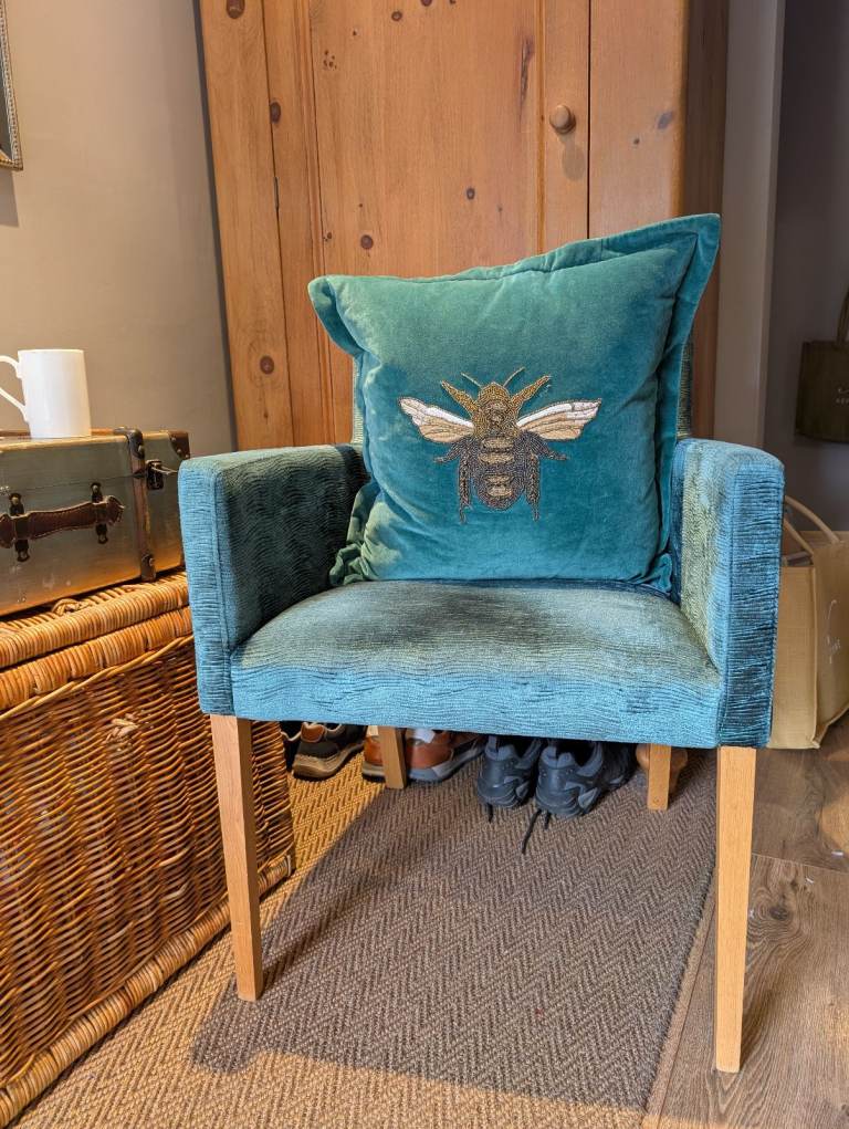 A green soft furnished chair made in Italy together with a green cushion with embroidered bee design.
