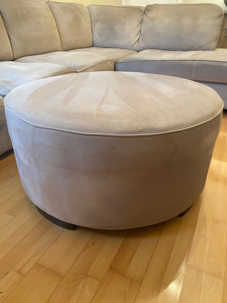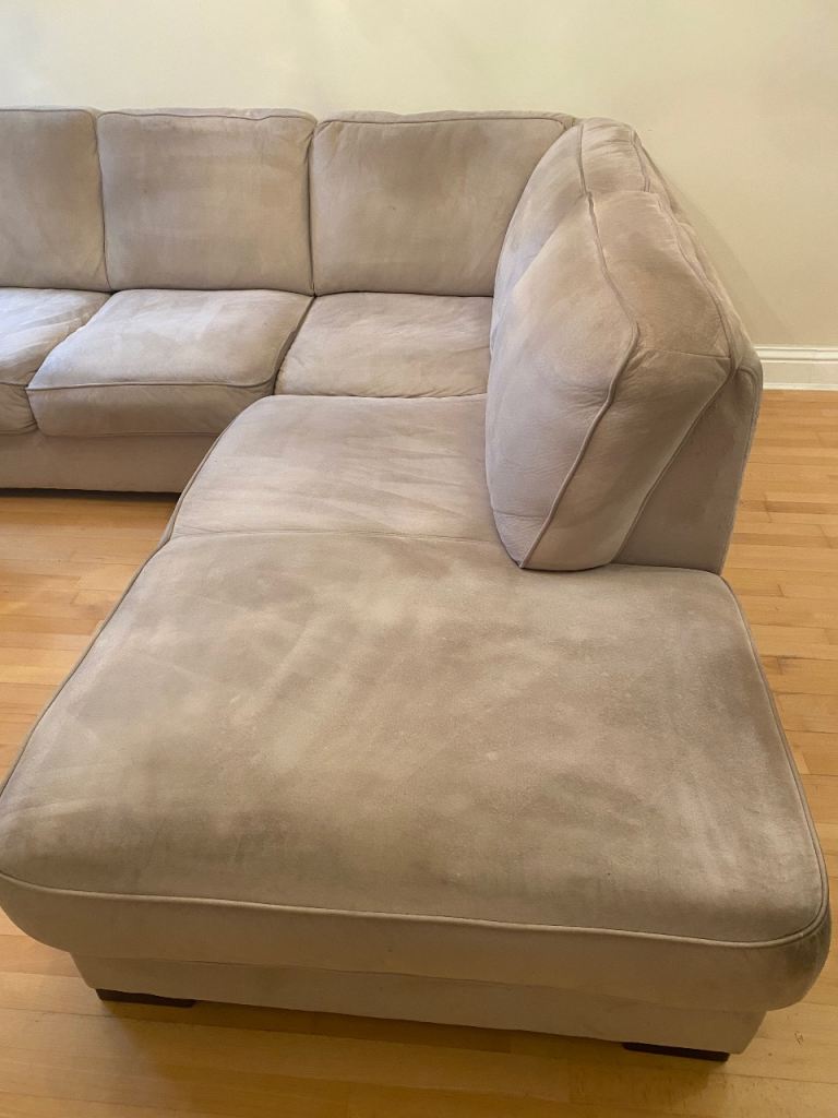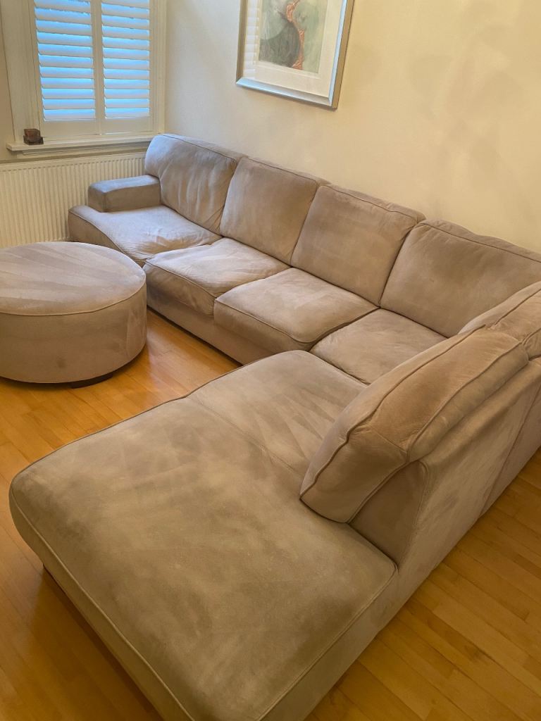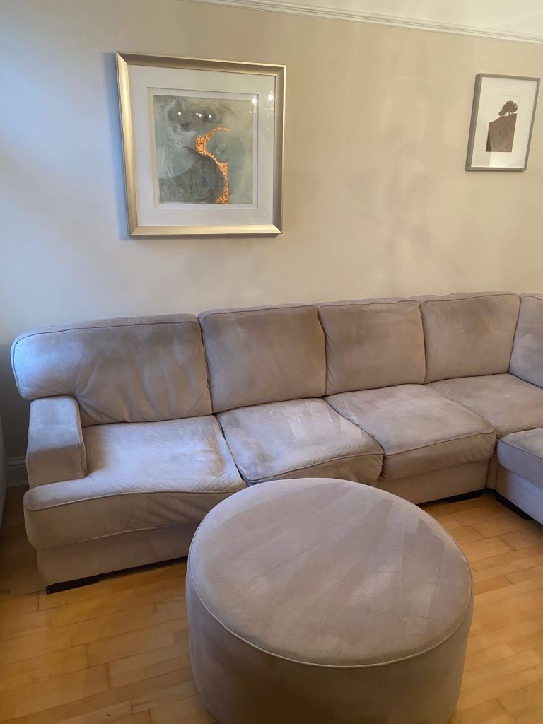 Posting for 12+ yearsL ShapedRossini Italian Suede sofa and Matching Pouffee