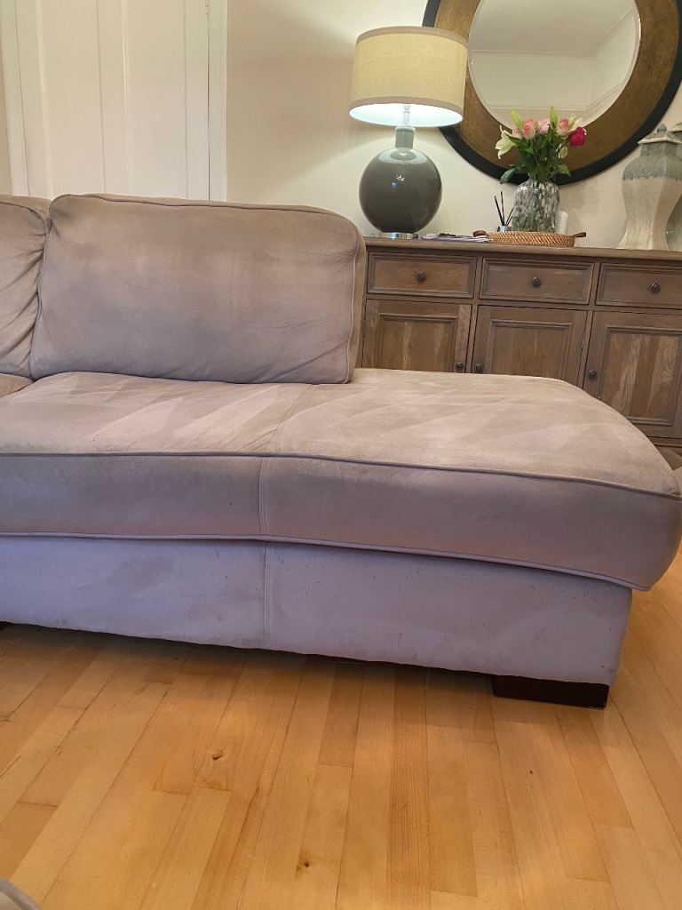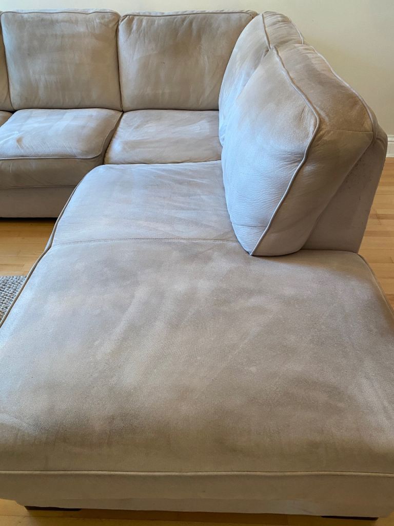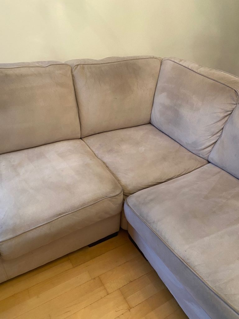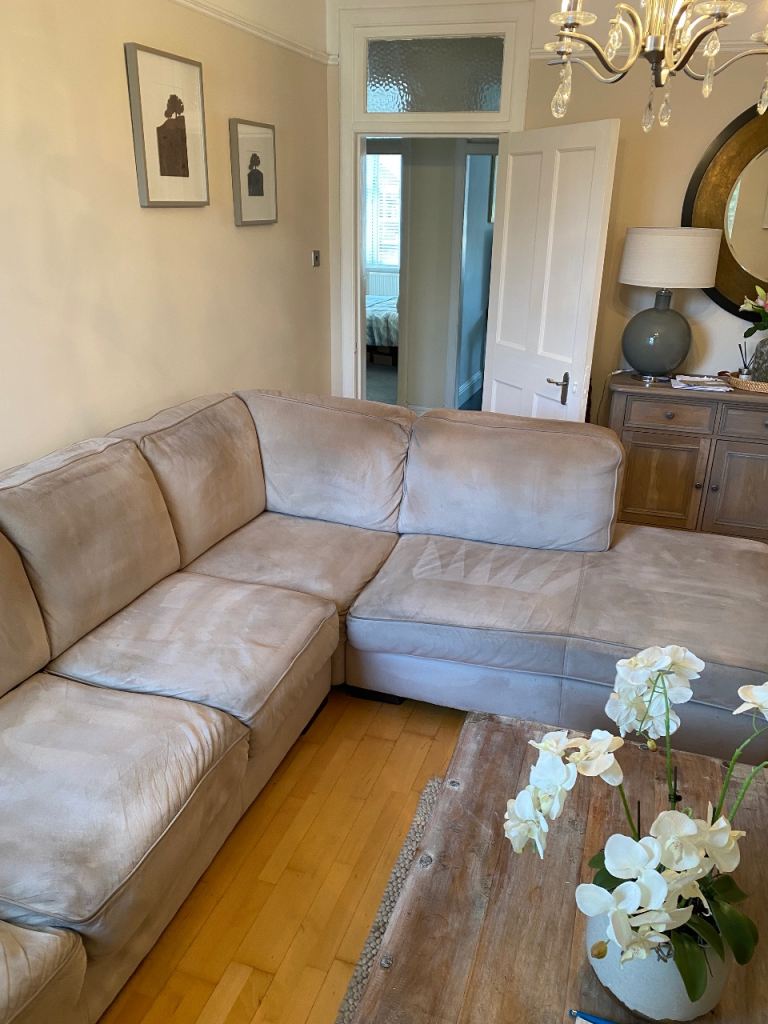 Posting for 12+ yearsL ShapedRossini Italian Suede sofa and Matching Pouffee