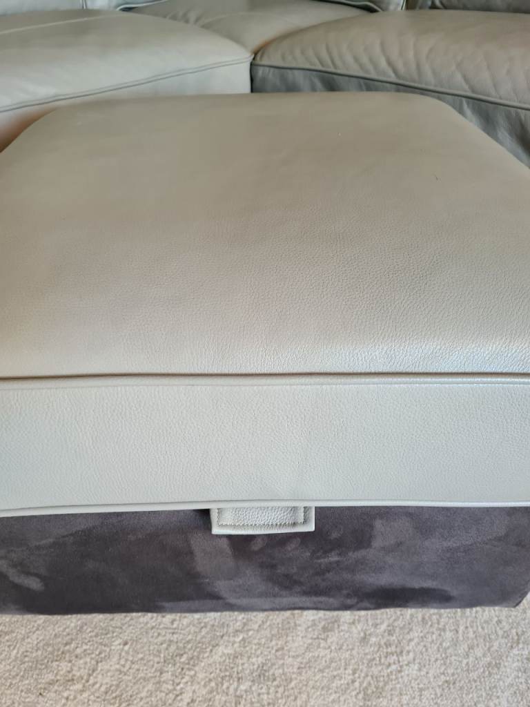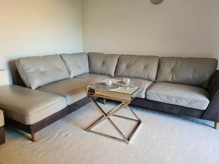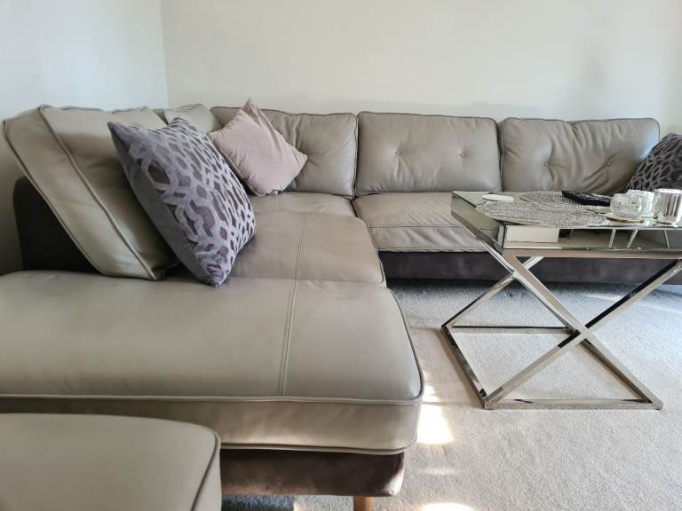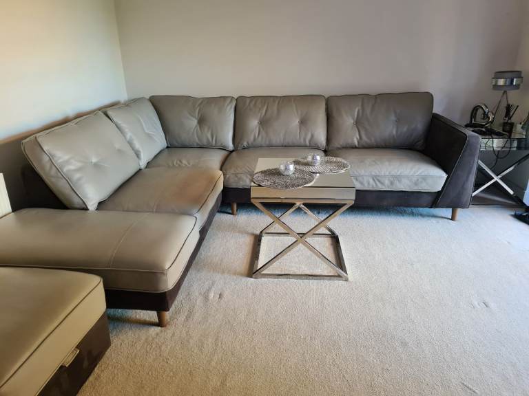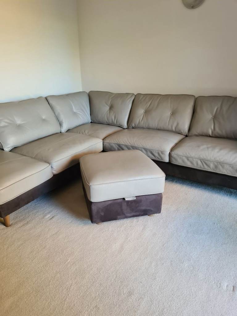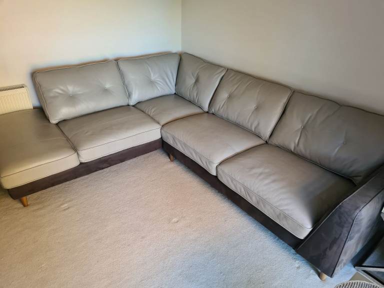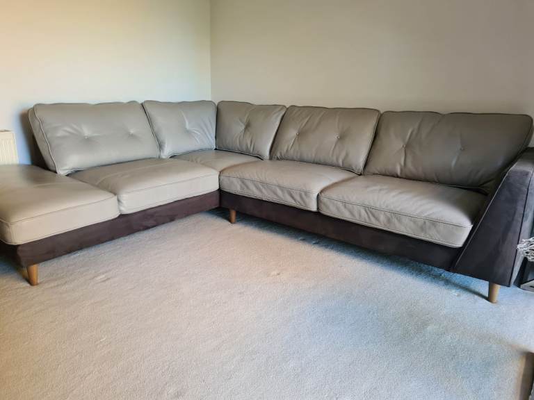 Beautiful large light grey leather corner sofa with alcantara dark grey leather side and bottom finish