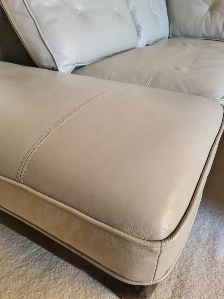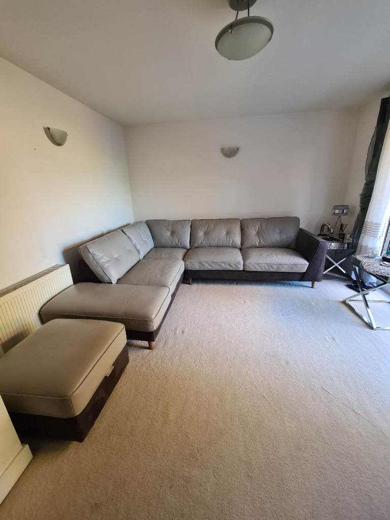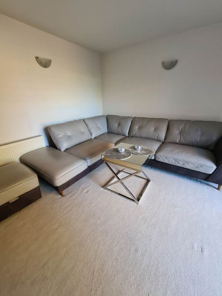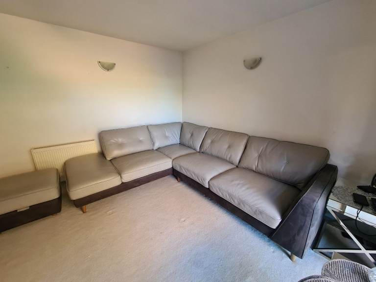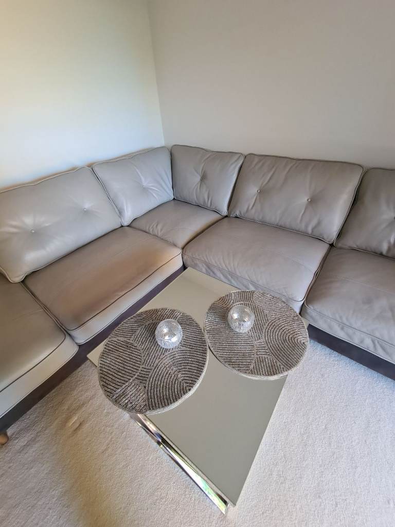 Beautiful large light grey leather corner sofa with alcantara dark grey leather side and bottom finish