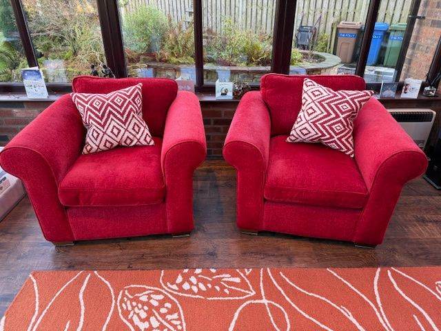 Pair of very comfortable armchairs originally bought from Laura Ashley and in a raspberry colour, The included scatter cushions were bought from Marks and Spencers, and also have a raspberry highlight. 1000mm wide x 950mm deep x 800mm high. From a smoke and pet free home. Buyer to pick up but could deliver locally at cost if required.