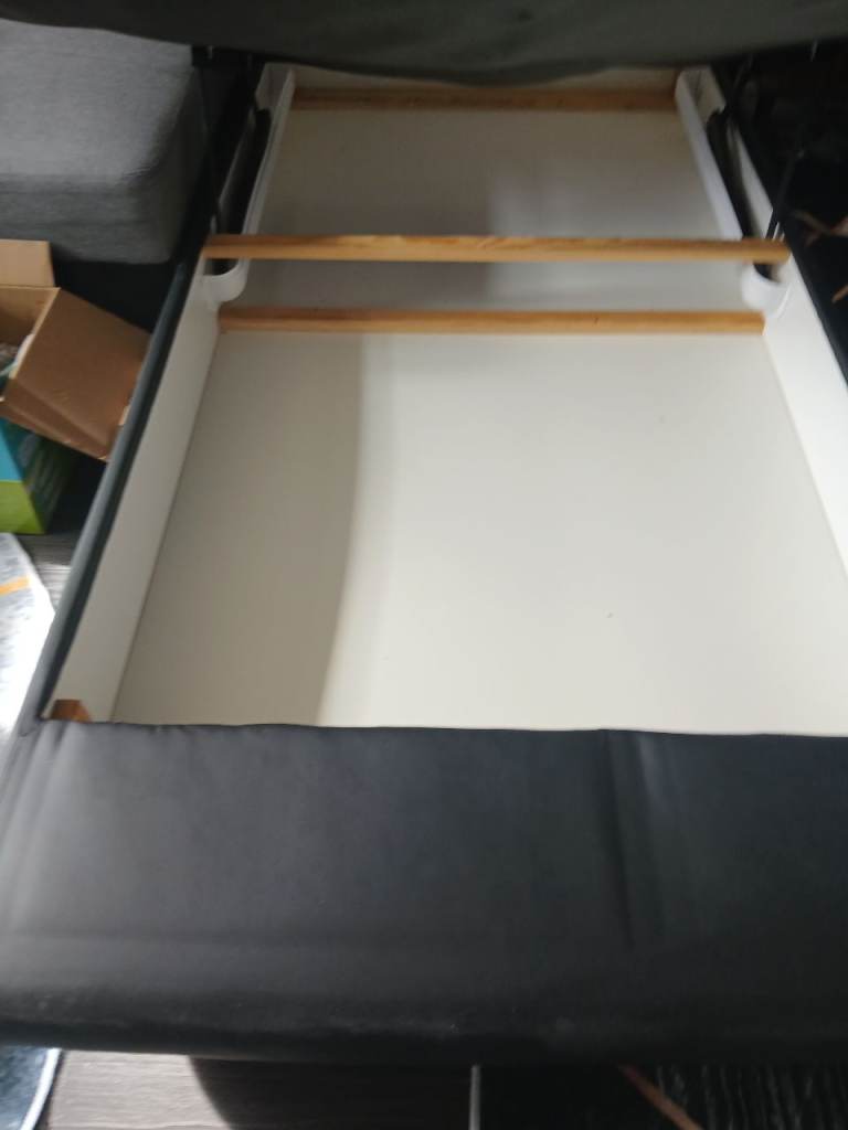 It separates into two parts. It is heavy and will need 2 people to move it.
