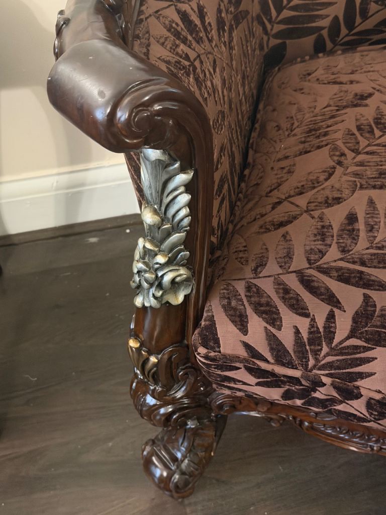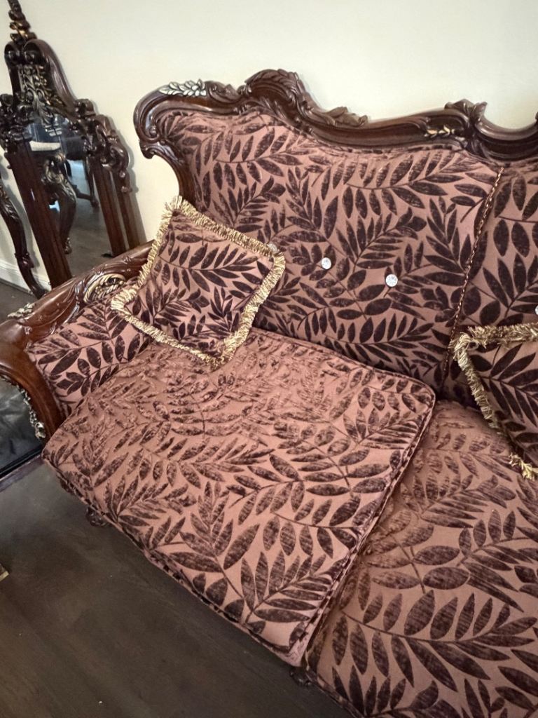 Elegant antique-style living room suite with detailed hand-carved wooden frames and upholstered cushions in a rich patterned fabric. This set adds a luxurious and classic look to any living room.