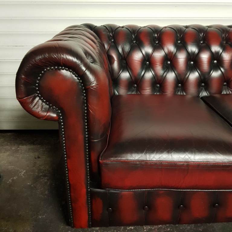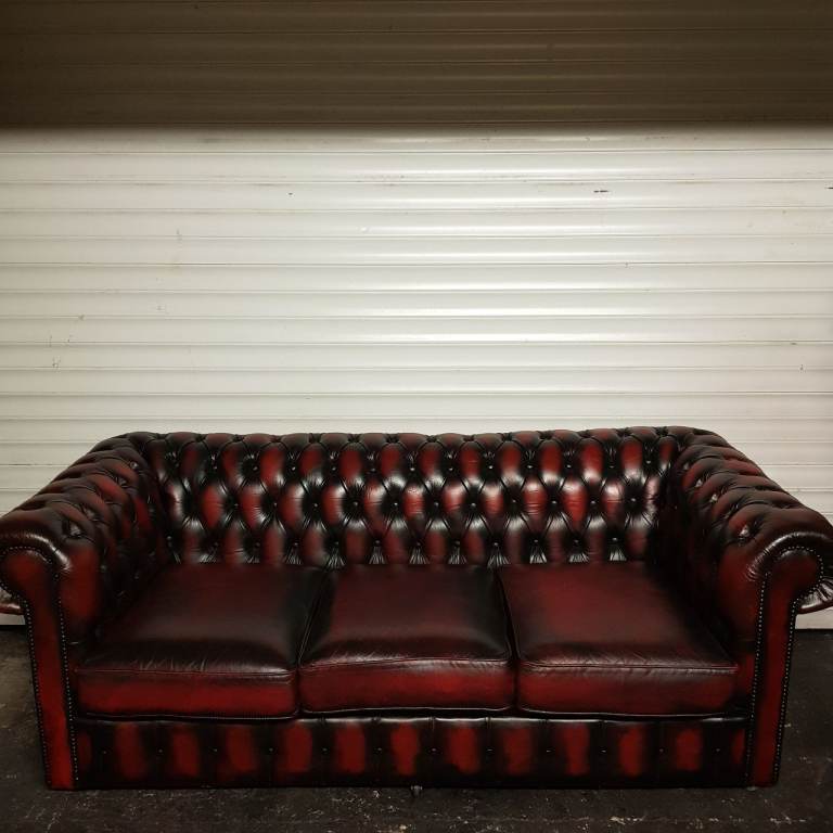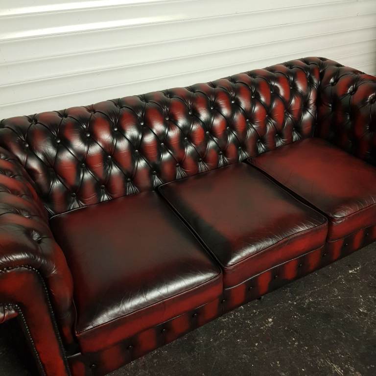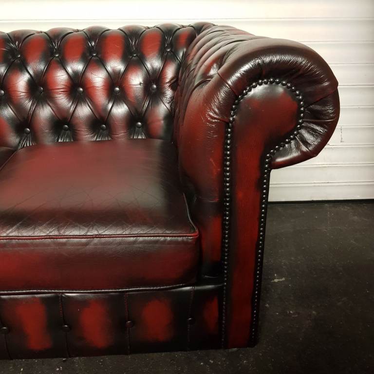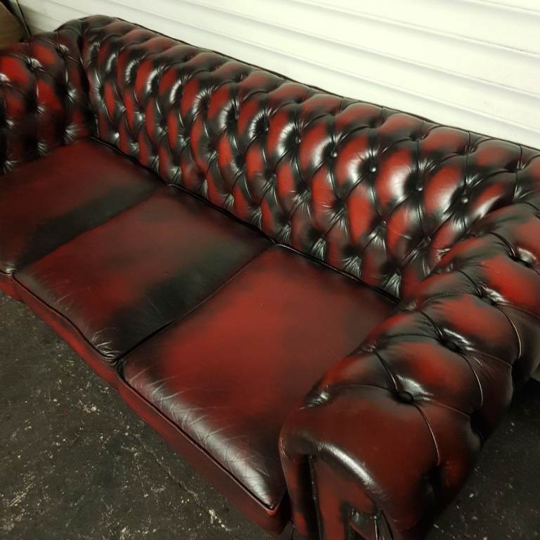 This is a stunning matching set. Both sofa and armchair are beautiful examples of classic leather Chesterfield pieces. The frames are very well made and solid. The leather is in healthy condition with no tears, stains or holes. The colourway is a beautiful traditional dark oxblood. These pieces have been very well cared for and are simply beautiful.